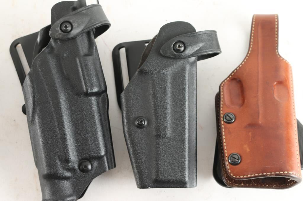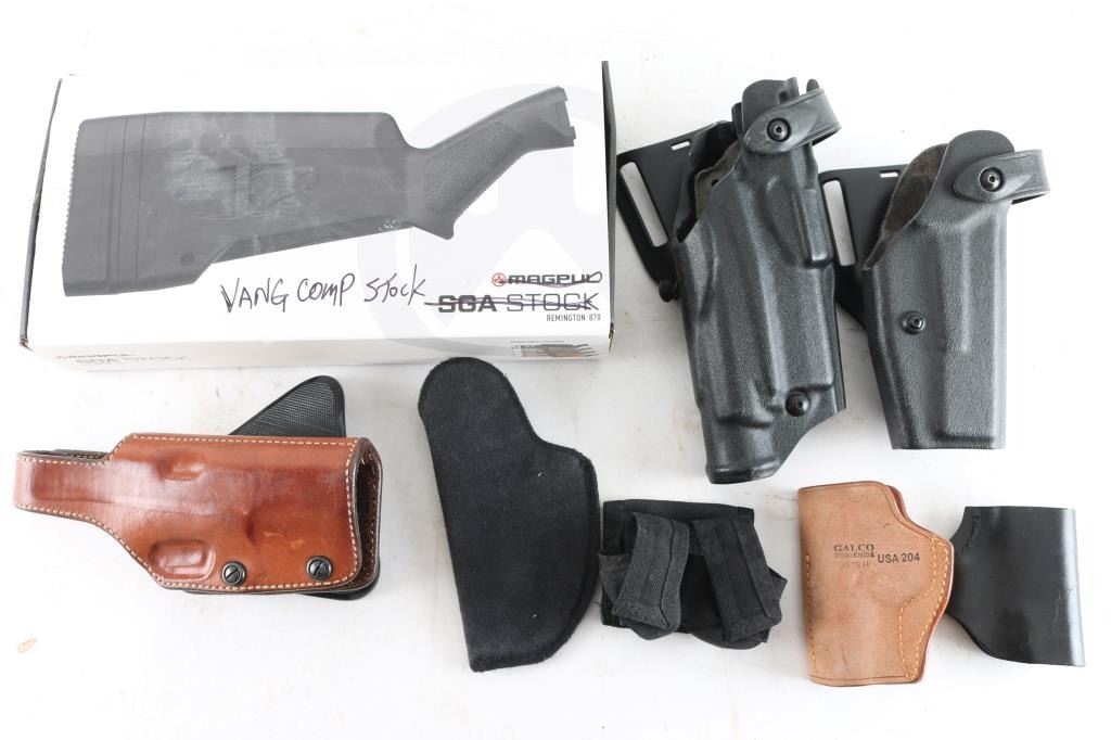 Includes 2 black Safariland, 2 tan leather Galcos, 1 black cloth Uncle Mike's, 1 unknown black small leather for revolver, 1 black nylon double pouch for speed loaders & 1 black polymer Vang Comp shotgun stock, in Magpul box.