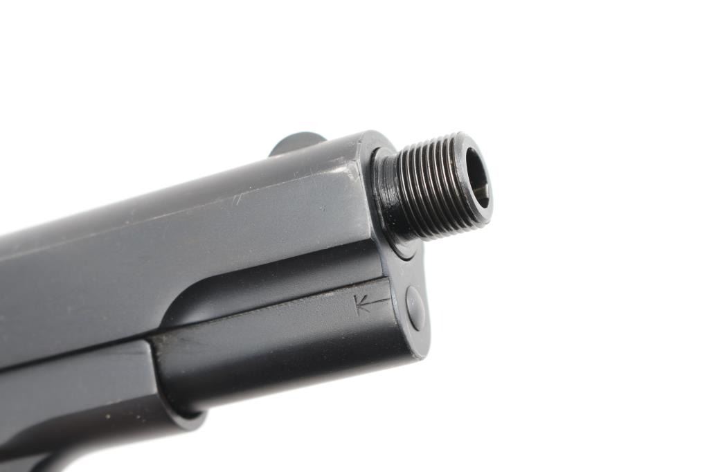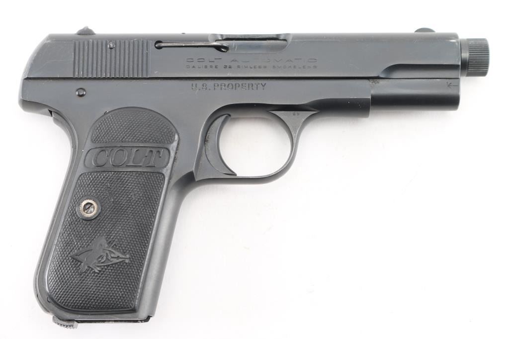 'Type 3' Re-finished, re-barreled vintage semiautomatic pistol manufactured circa 1922. Features checkered black hard rubber grips with embossed Colt banners and Rampant Colt logos, re-barreled with a 4" threaded barrel, fixed sights, manual safety, grip safety, heel magazine release. Bore is excellent/bright. Parkerized re-finish is excellent. Standard Colt markings are overall readable, showing some erosion, partial loss to front legs of Rampant Colt logo. Marked "U.S. PROPERTY" on right side of frame, in crisp sharp letters. Grips are very good condition with smoothing of embossed features. Includes the original Colt factory barrel, parkerized to match, fair condition pitted bore. No magazine. Comes in a nice dark stained wood form fitted green lined display case with spaces for pistol, mags & accessories, two 25 rd cartridge organizers, 50 rounds PPU hollow point ammo. Also comes with a Colt factory letter, shipped to Edwards & Walker Company of Portland Maine on Feb 16, 1922 as part of a three gun shipment. Condition is near NRA Excellent as Restored. C&R Firearm.