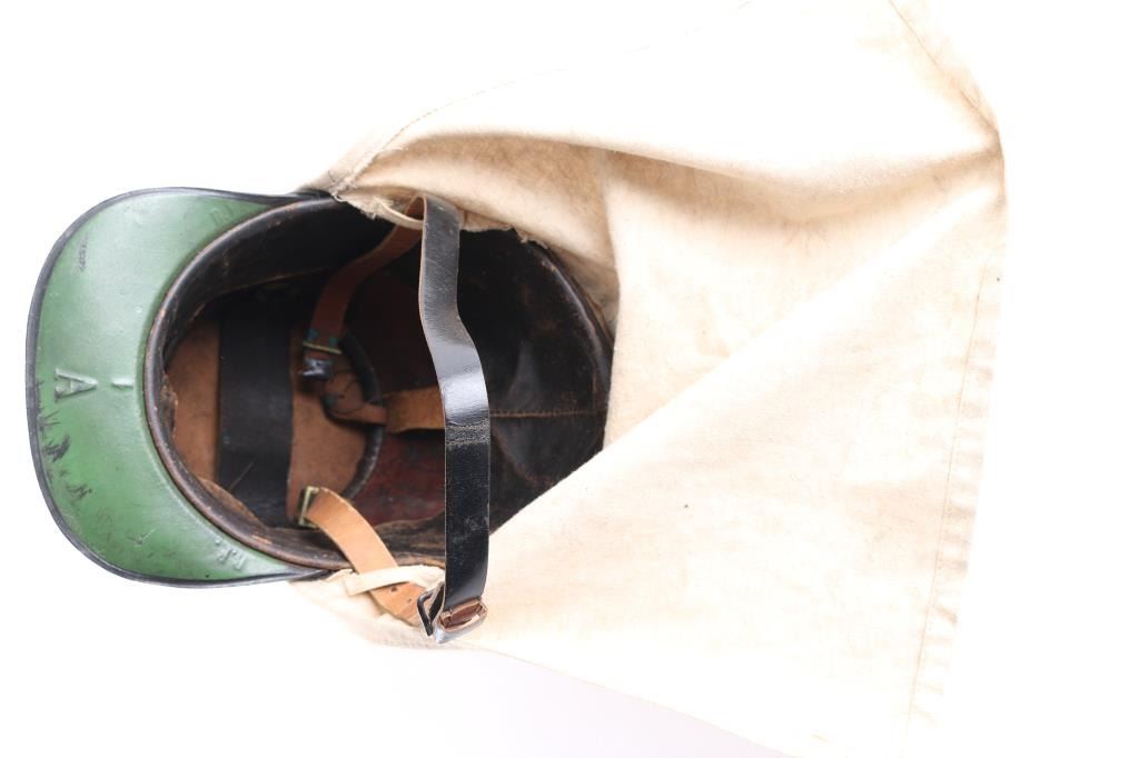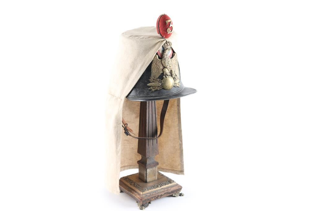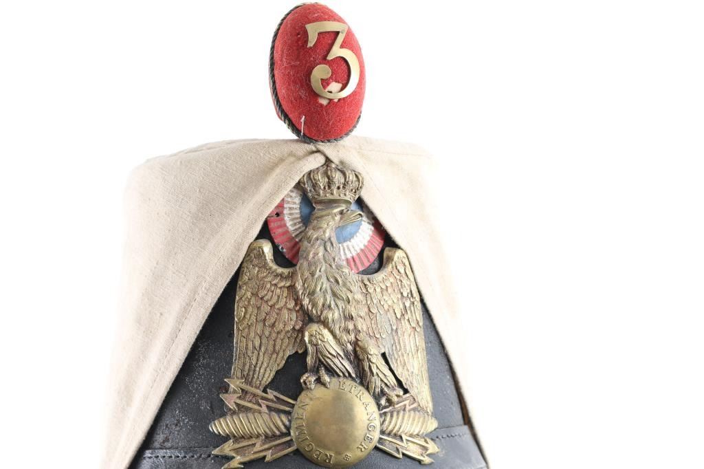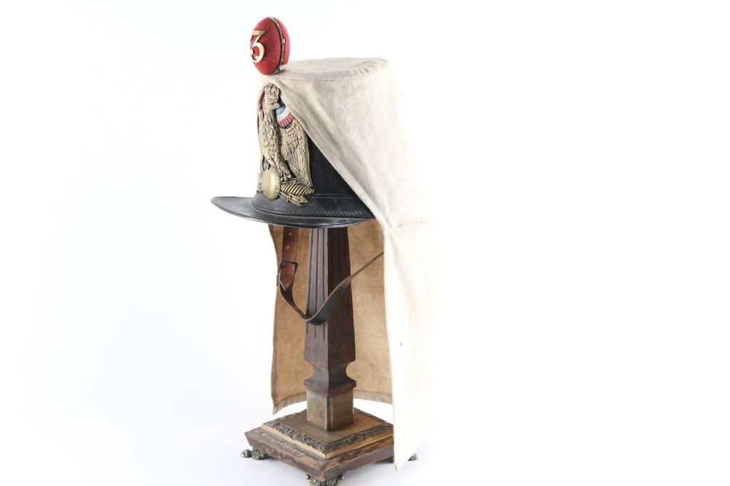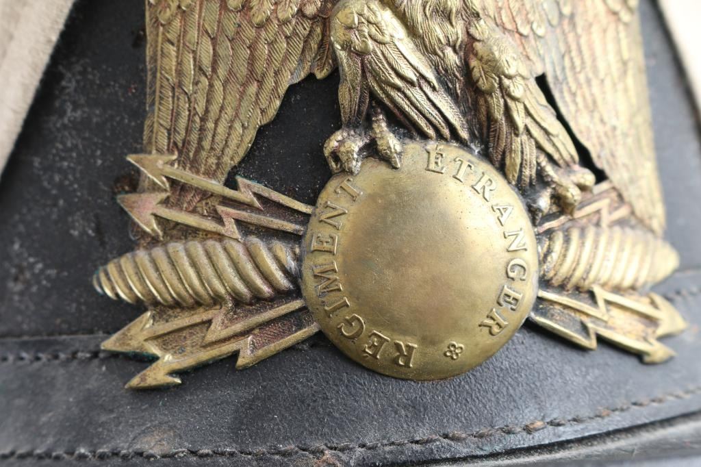 This is a newer made copy of the French Model 1860 Infantry shako. Made to exact specifications. Very well made., It has the brass imperial eagle/crown plate clutching lighting bolts, oval has "Regiment Etranger", French Tri Color cockade, and red pompom with brass "3" attached. The strange thing is the 3rd R.E.I, 3rd Foreign Infantry Regiment of the Foreign Legion was founded in 1915. It has a white cloth neck/sun protector attached. The stamped brass plate is very well made, not put together. Possibly made for display, or parade purposes. Small size. We could not find any reference to this shako. It is vintage with some age to it. Very Interesting piece. Very Good condition. Comes on a ornate wood/brass stand/