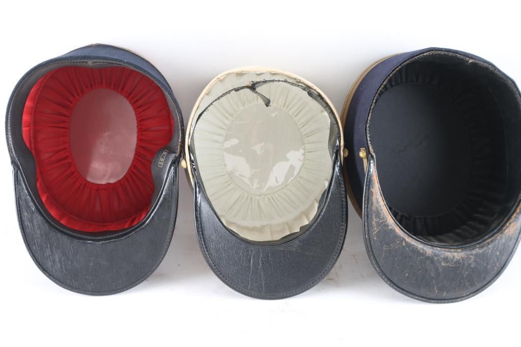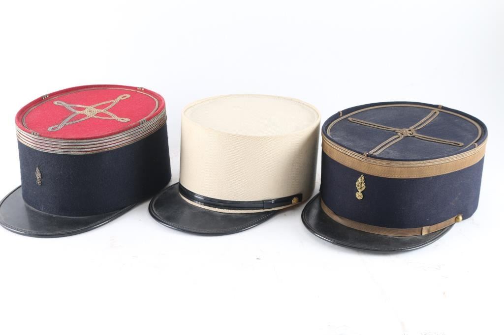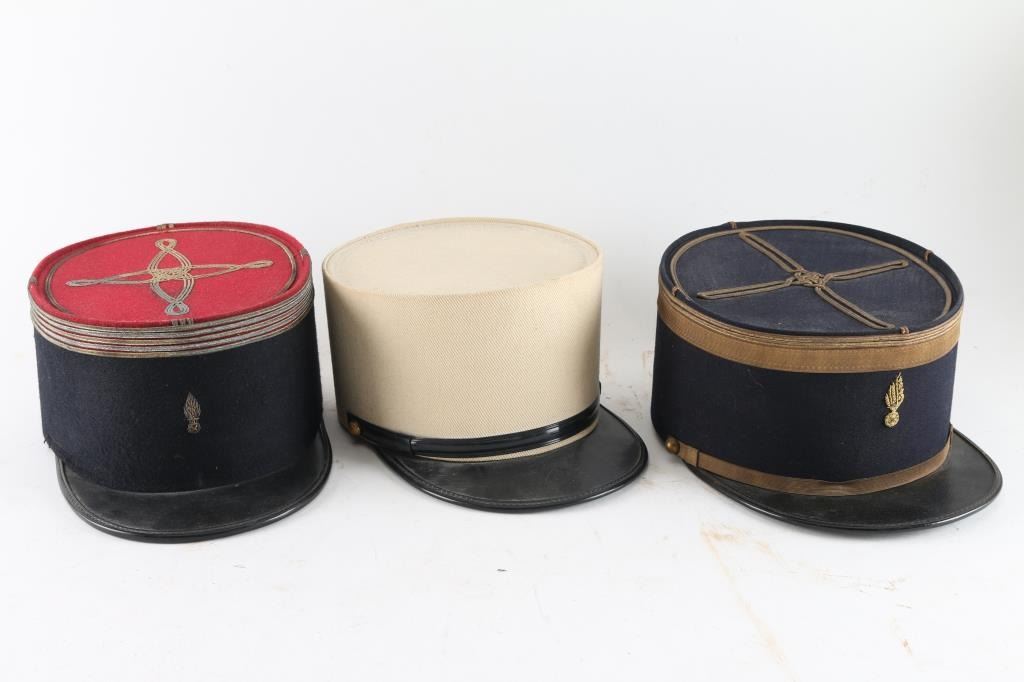 Three Total. 1) Officers dark blue wool band measuring approximately 4" high with a blue wool crown with quatrefoil and gold toned piping. An upright, embroidered wire flaming grenade is to the front. A gold leather chinstrap is held in place by a pair of plain brass buttons. The interior is lined in black cloth. . Late 1930's or early 1940's model. Excellent. 2) Same as above, but this is the iconic plain white kepi. FL side buttons, white lining. Excellent. 3) Officers Kepi, blue felt, red crown, with gold trimmings. Embroidered gold flaming bomb. Around the upper part of the kepi are four bands of gold piping, denoting the rank of Chef de Batallion (Major), quatrefoil design to the crown. Missing chinstrap, & side buttons. Size 56.5. Overall condition is very good. From the Joseph Musso Collection