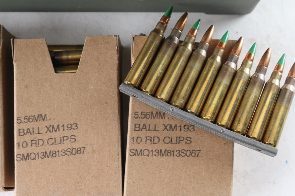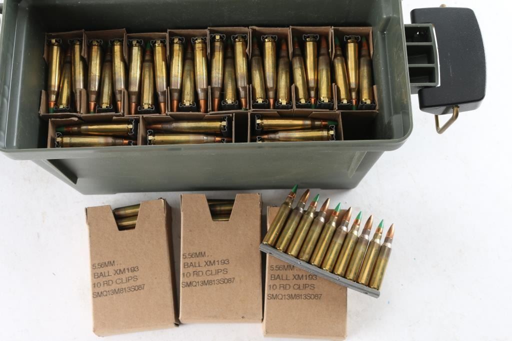 Approx. 420 round of new factory 5.56 Nato ammunition, XM193 14 cardboard packs of 3 - 10 round clips of 5.56 each. All in plastic ammo can.