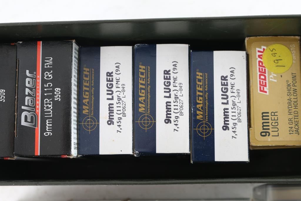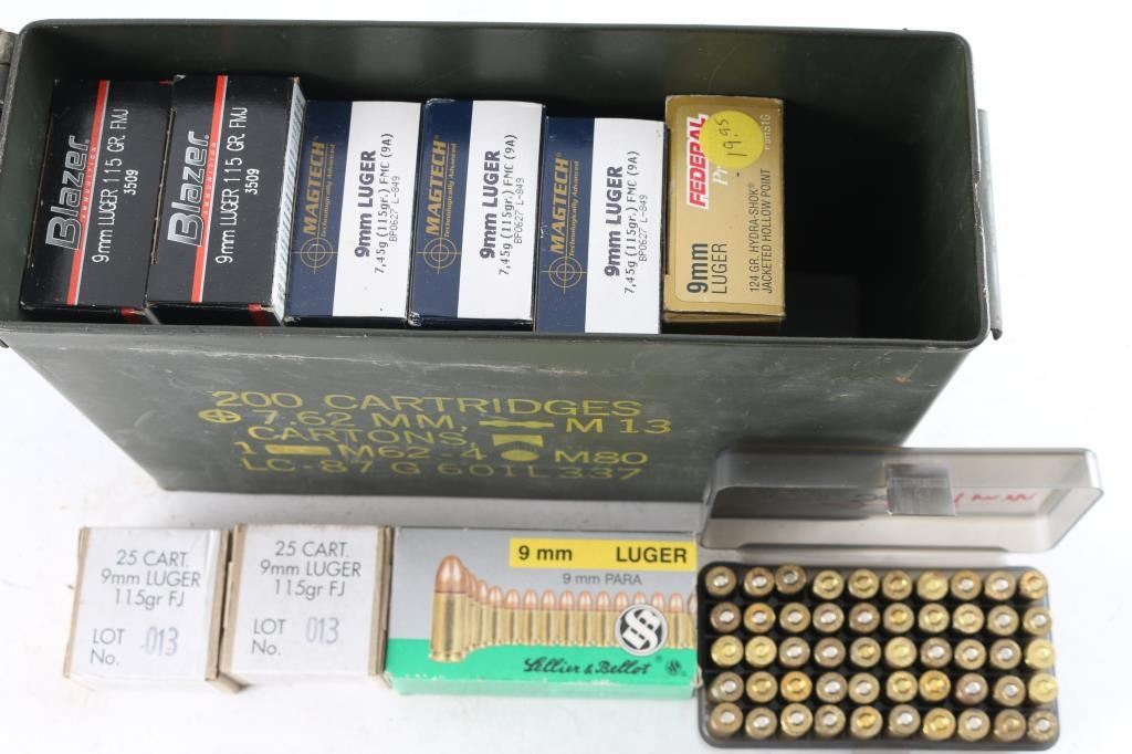 Approx. 450 rounds of factory new 9mm ammunition, various makers/loads, in factory boxes. All in metal ammo can.