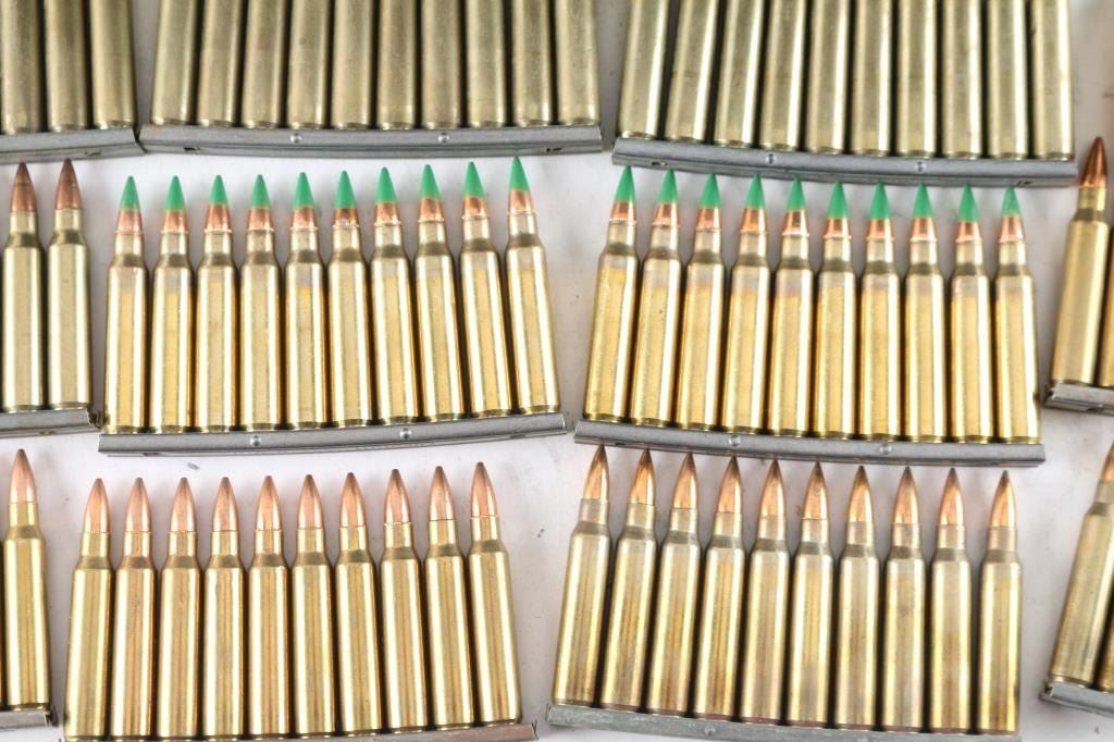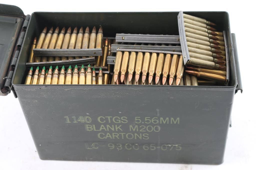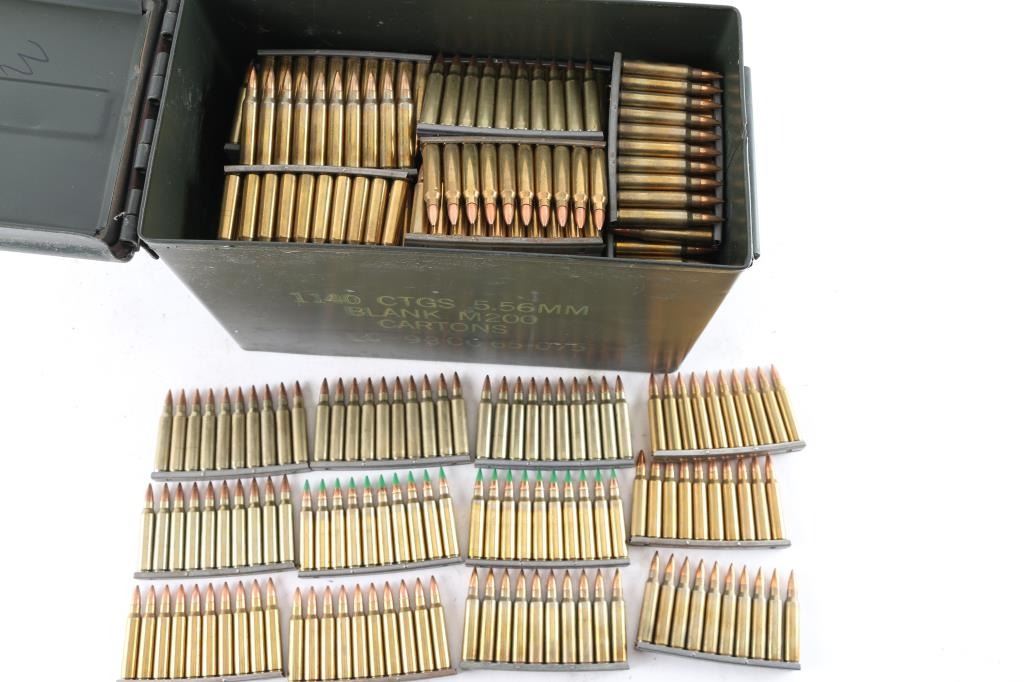 Approx. 1000 rounds of new factory .223 ammunition, FMJ & Green tip, on 10 round stripper clips. All in metal ammo can.
