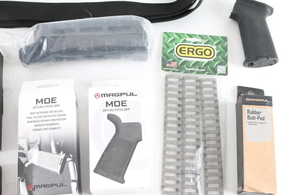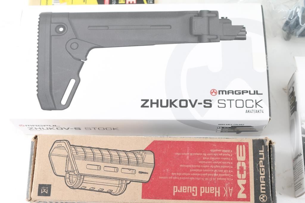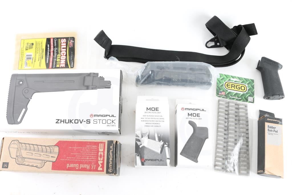 includes: 1 - Zhukov-S stock for AK-47, 2 - MOE AK handguards, 1 - MOE AK pistol grip, 2 - MOE AR15/M4 pistol grips, 1 - PRS extended Butt-pad, 1 - 1 1/4" black web sling w/ clip & QD attachments, 1 - set of Ergo Picatinny rail covers & 1 - Pro Shot silicone cloth. All in excellent condition and in factory boxes.