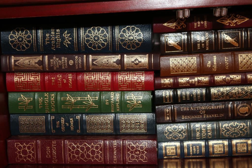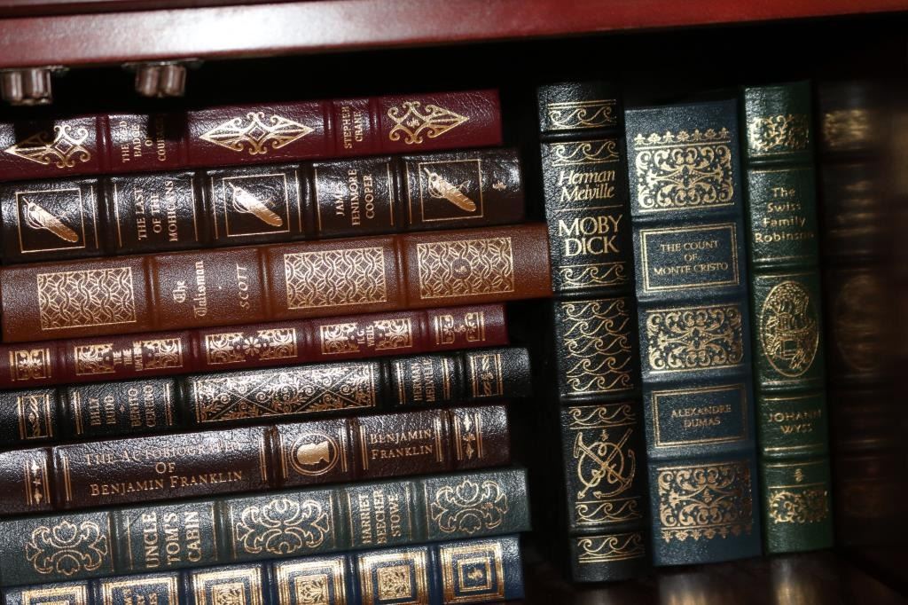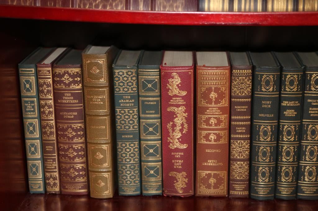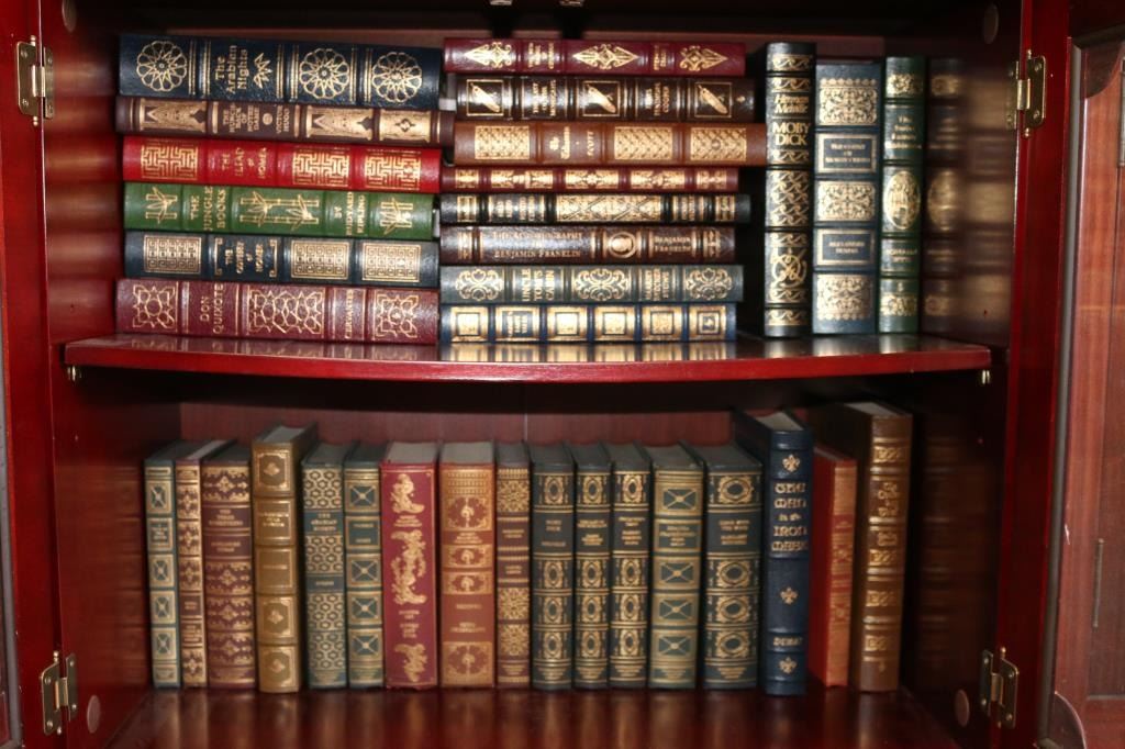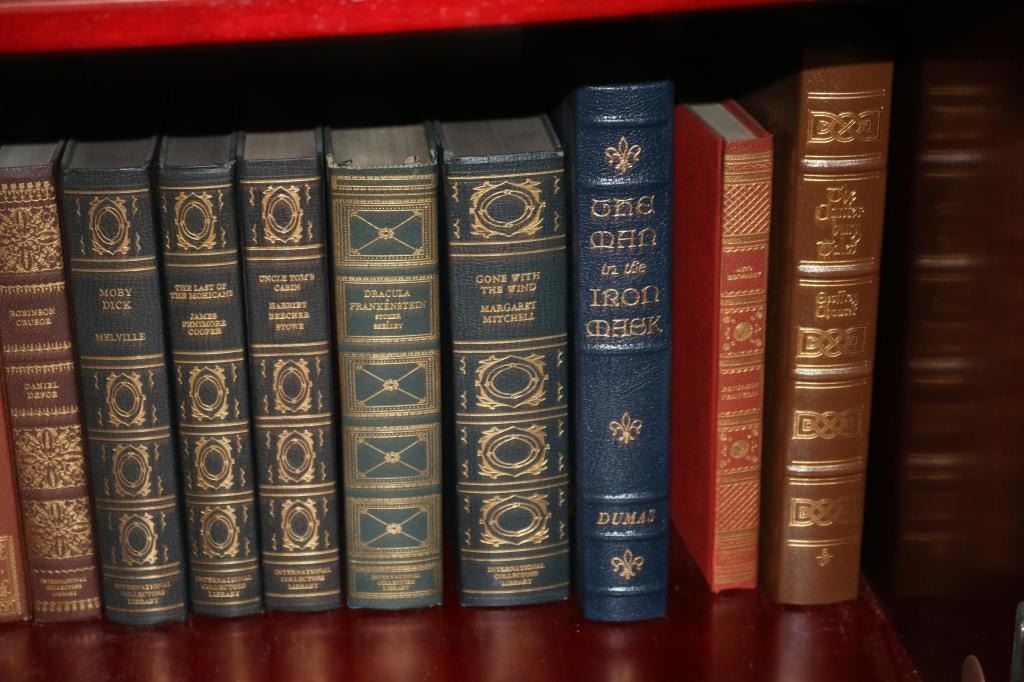 Beautiful collection of books including Moby Dick, Count of Monte Christo, Swiss Family Robinson, Dracula, Arabian Nights, Gone with the Wind, and more. Comes with the bookcase, approx 31"x29"x16. No shipping of this lot. FOR LOCAL PICKUP ONLY. From the Estate of Joseph Musso Collection.