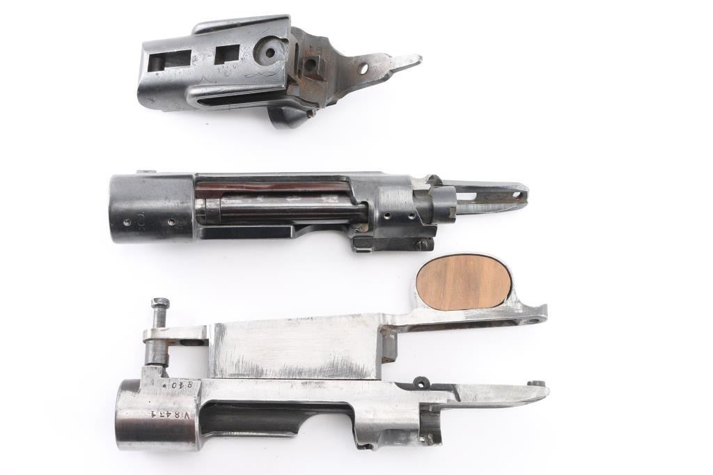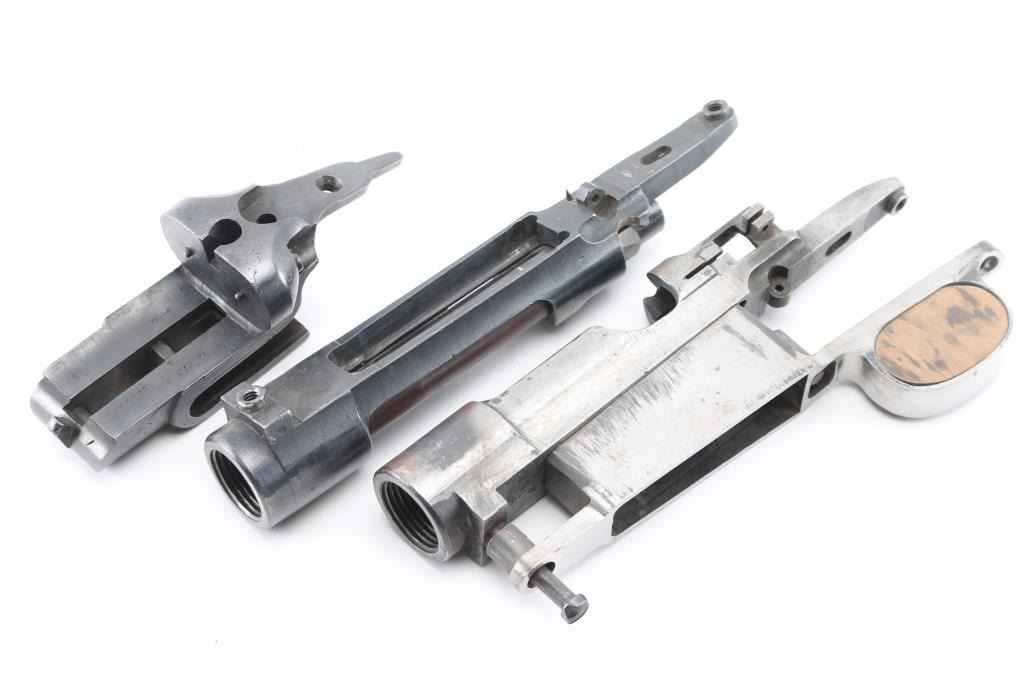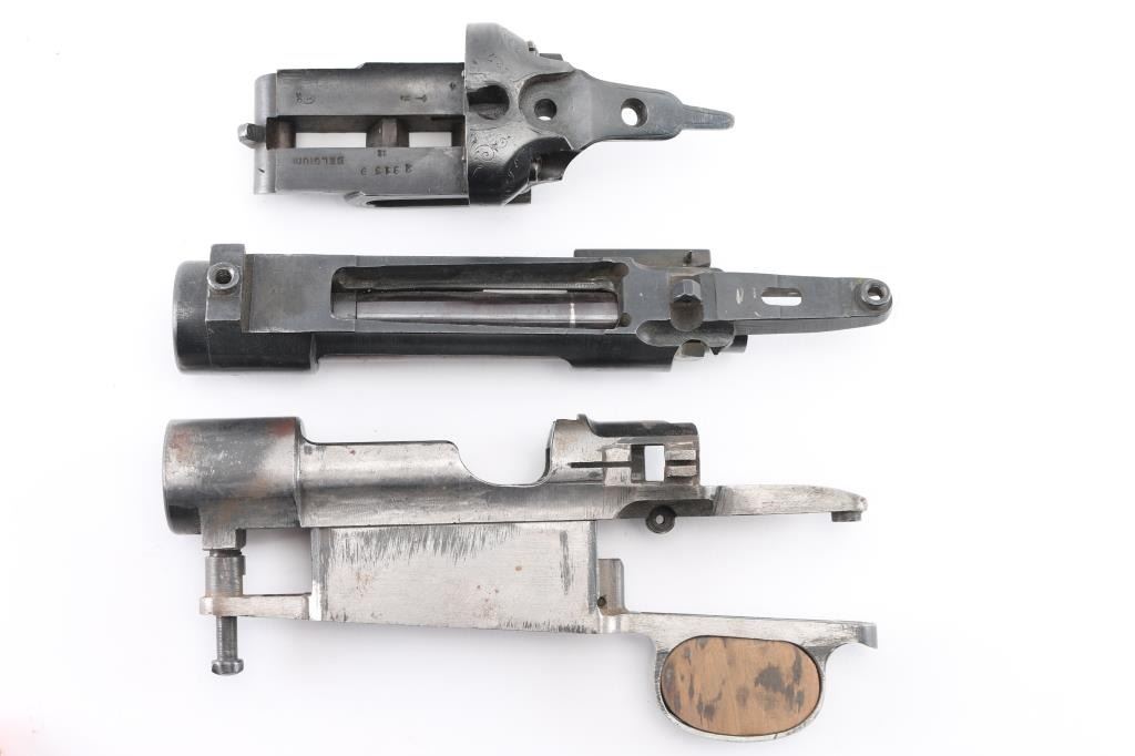 1) Belgian Side x Side receiver, side hammer type, includes firing pins, reblued in a dark color, 12 GA size, overall Good condition. 2) Waffenwerke Brunn Model 98 receiver, with bolt body (stem and knob removed), drilled & tapped, dou" crest visible but faint. Overall Good condition. 3) Unknown Mauser 98 receiver, with triggerguard, cleaned bare metal, overall Good condition. *** C&R Firearms ***