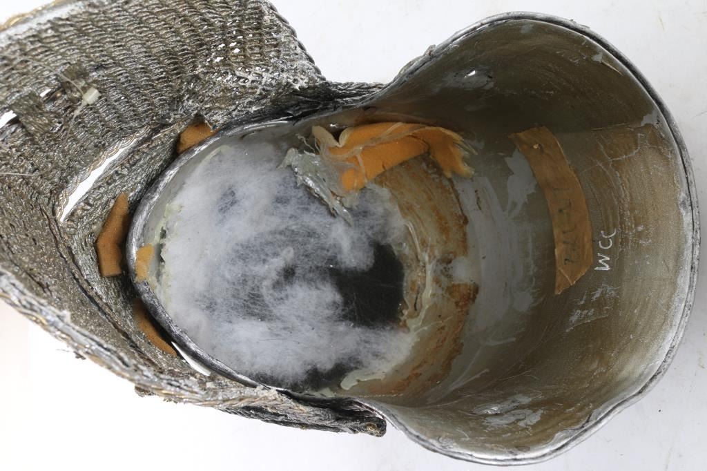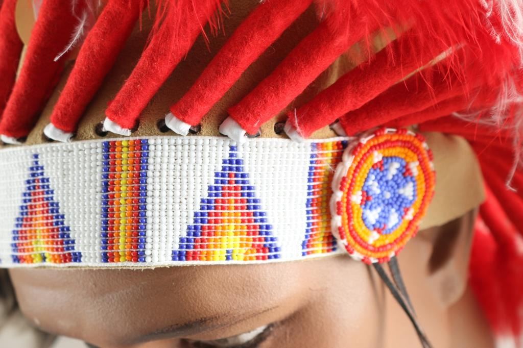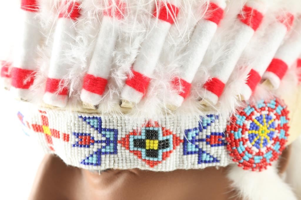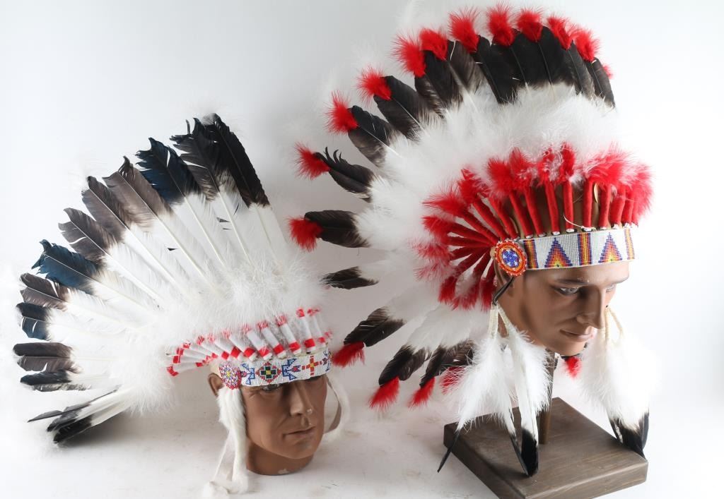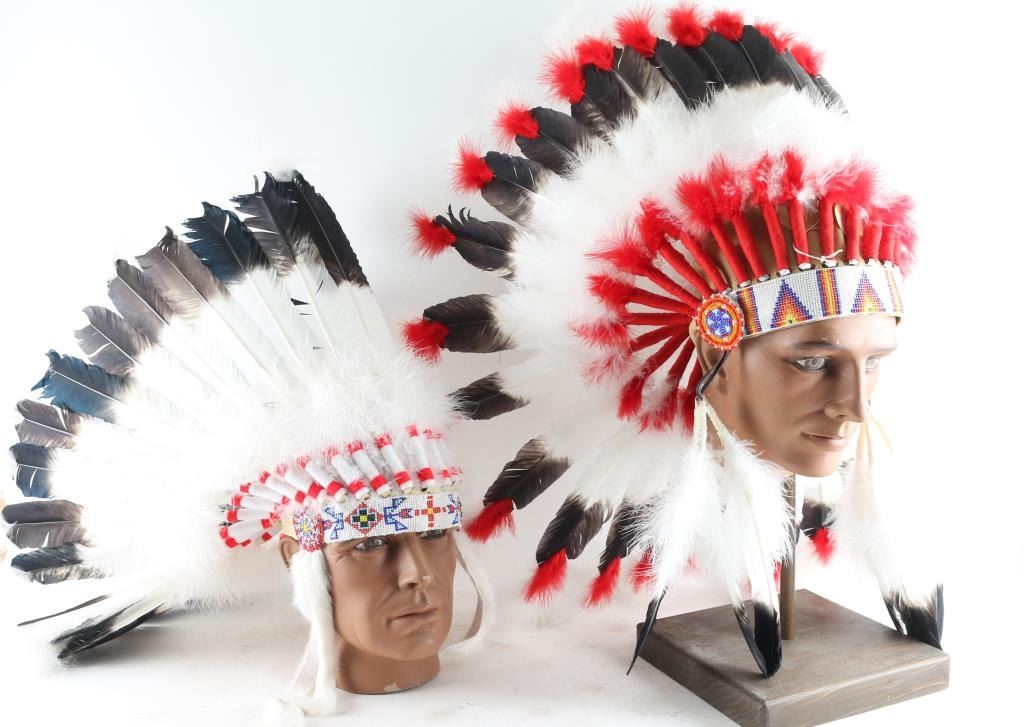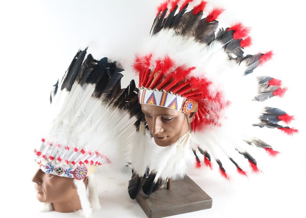 One is an antique ceremonial hat and the second is a military helmet with face shield for a movie production and two indian feather head-dresses, one primarily white and black and the other red, white and black, beautifully made. From the Estate of Joseph Musso.