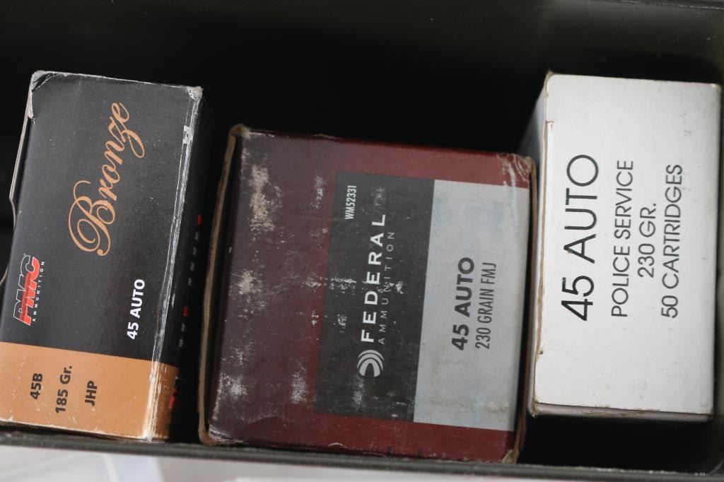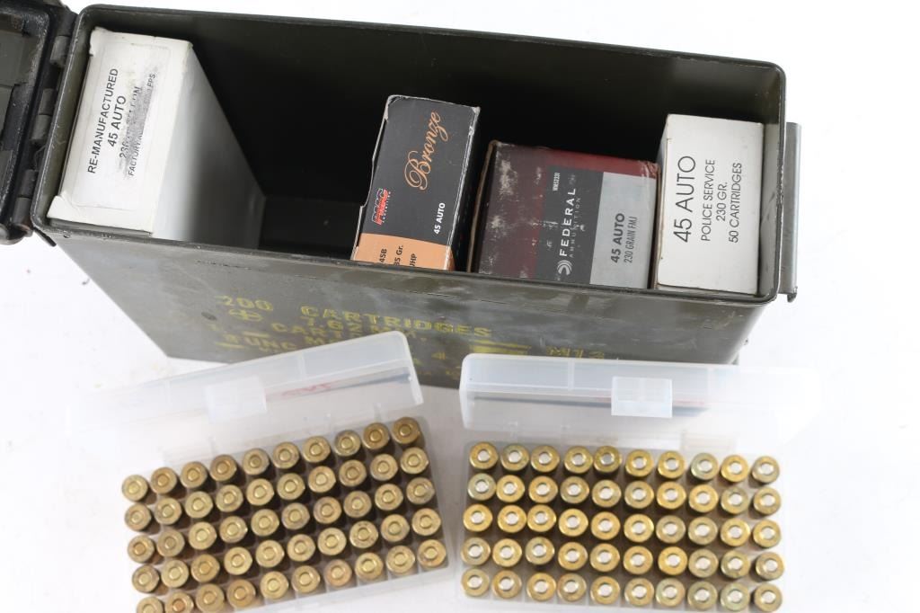 Approx. 350 rounds of factory new and reloaded 45 ACP ammunition, various makes/bullets, in factory and plastic boxes. All in metal ammo can.