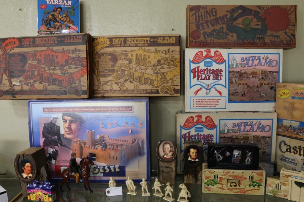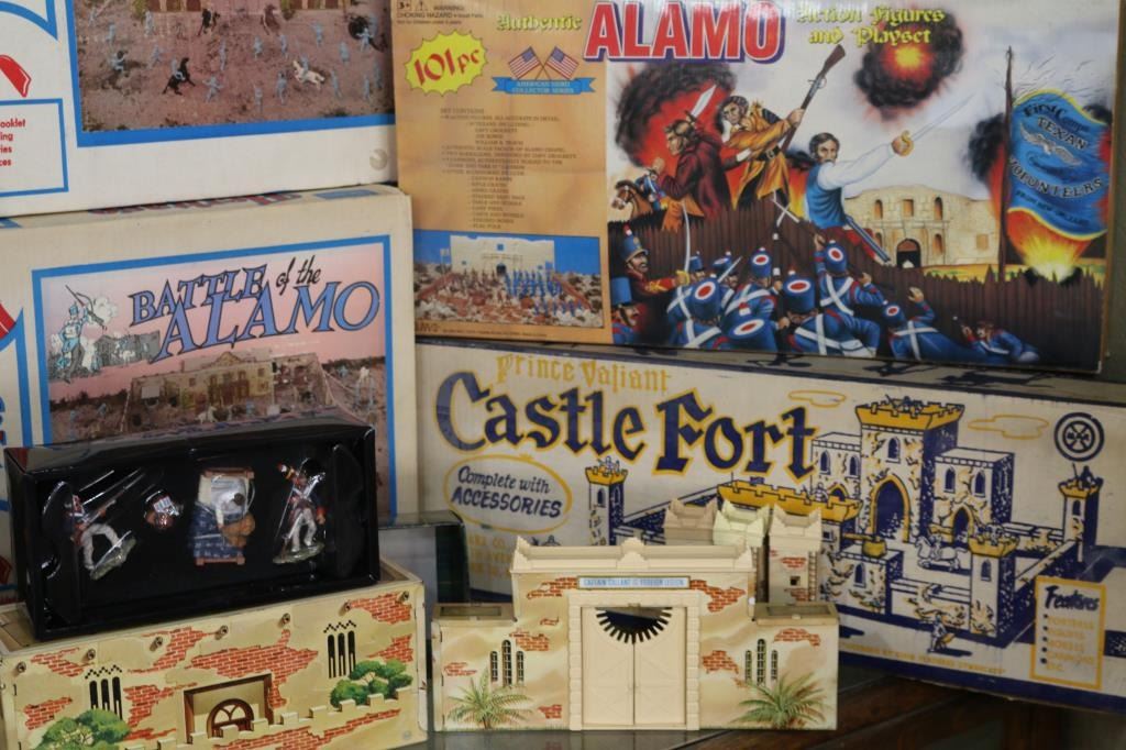 Several toys including two Sears Heritage Play Sets, the Original 1950's Hartland Jim Bowie and his Horse Blaze, with original box [torn], Fort Apache, Vintage Official Davy Crockett At The Alamo Playset W/ Accessories-101 piece Alamo Action Figure Play Set from the American Hero Collection Series, two Walt Disney's "official" Davey Crocket at the Alamo, King of the Frontier boxed sets, Roy Rogers Western Town, Beau Gest The Tower of Death and Tarzan on the Radio boxed like new set of 20 audio cassettes (60 programs-30 hours). Overall, unknown number of parts available and/or missing - unknown working or non-working conditions. From the Estate of Joe Musso.