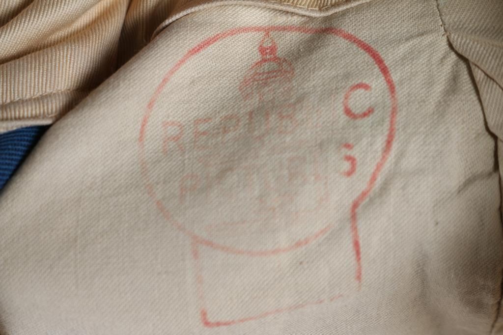This Movie Prop Mexican Army Infantry Rifleman's Uniform was used in the 1960 John Wayne movie the Alamo as these came form the estate of Joe Musso, who worked on the film, and was a personal friend of John Wayne. Tunic stamped in sleeve "W.C.C." Trousers marked "Western Costume Co. Hollywood Ca.", who supplied the uniforms. Blue wool tunic with red collar/cuffs, nine domed, brass buttons. Trousers are dark blue wool with red stripes. White leather cross strap with Mexican Eagle/Snake brass plate, holding a French style short sword, and bayonet. Very good Condition.