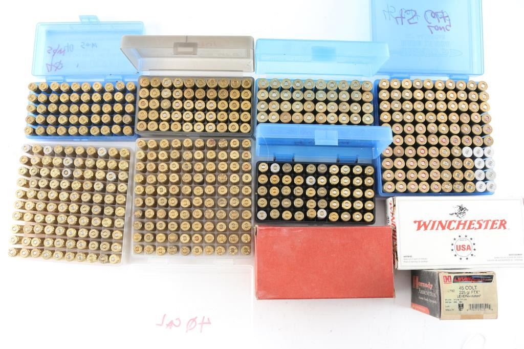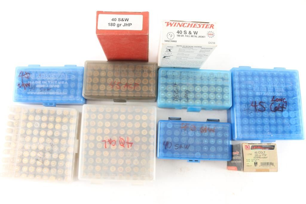 Approx. 650 rounds total. Approx. 400 rnds of 40 S& W; approx. 250 rnds of 45 Long Colt. Various makes/bullets & reloads. All in factory boxes and plastic cases.