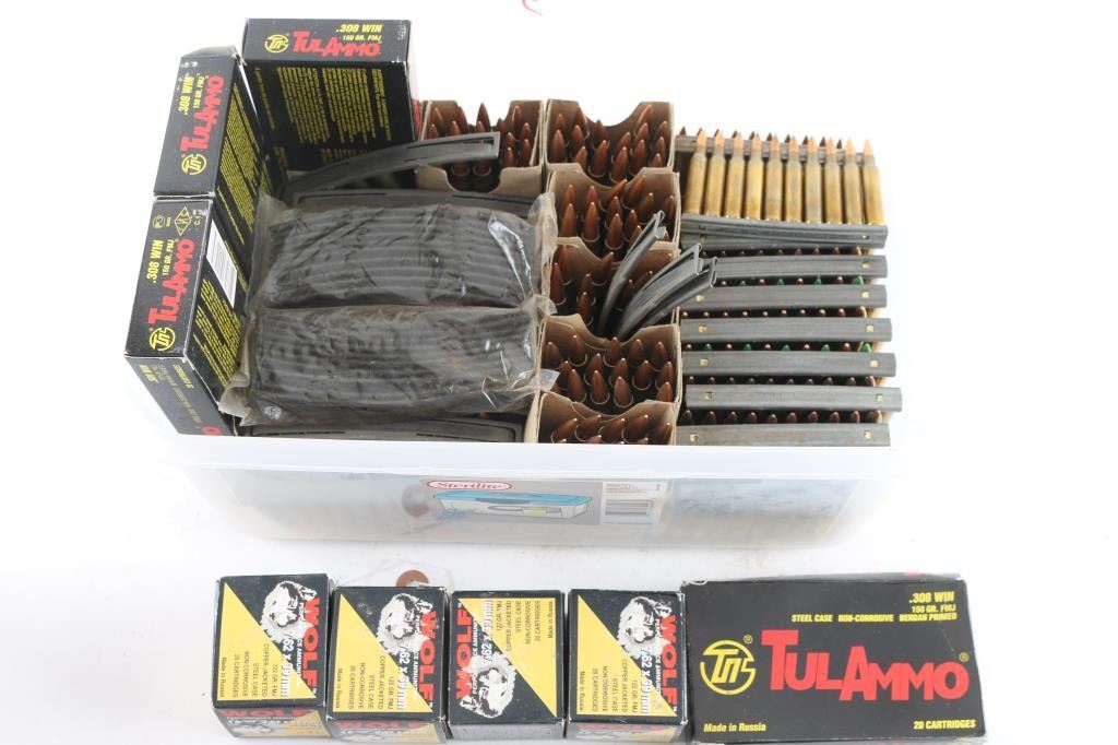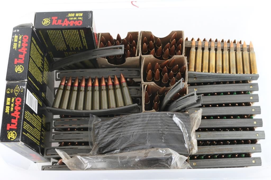 Approx. 520 rounds total. Approx. 230 rnds of 7.62 X 39mm; approx. 210 rnds of 5.56 X 45mm; approx. 90 rnds of 7.62 X 54mm; approx. 80 rnds of 308; various brands in factory boxes, cartons & on stripper clips.
