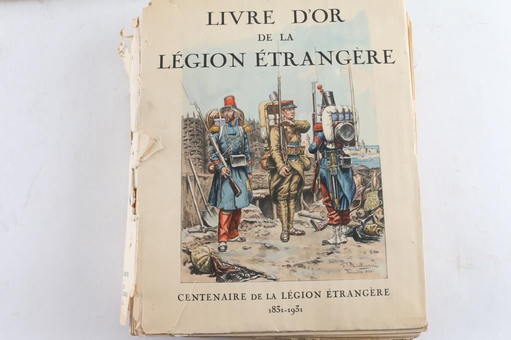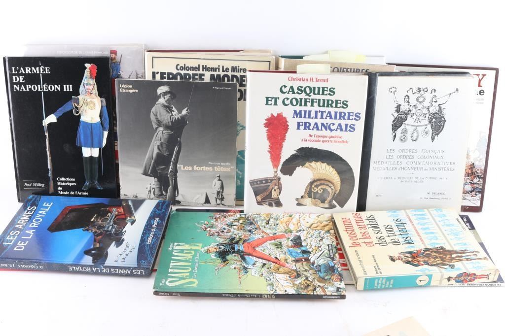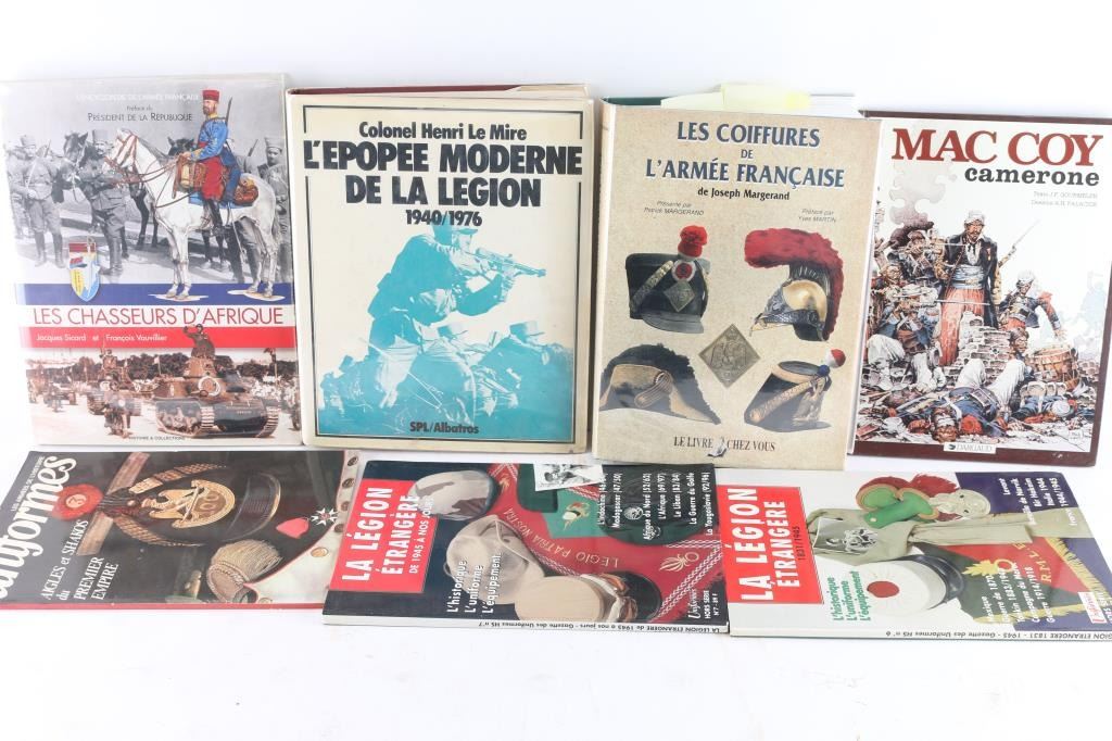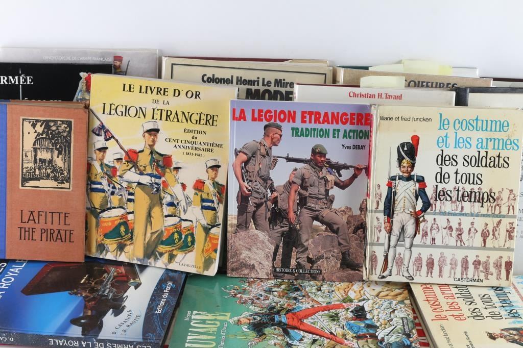 many referencing Napoleon, many written in French, with the exception of LaFitte, the Pirate,written in English, by Lyle Saxon, copyright date 1930 New Orleans, also included are hardbound soldier comics by MacCoy-Camerone and more.