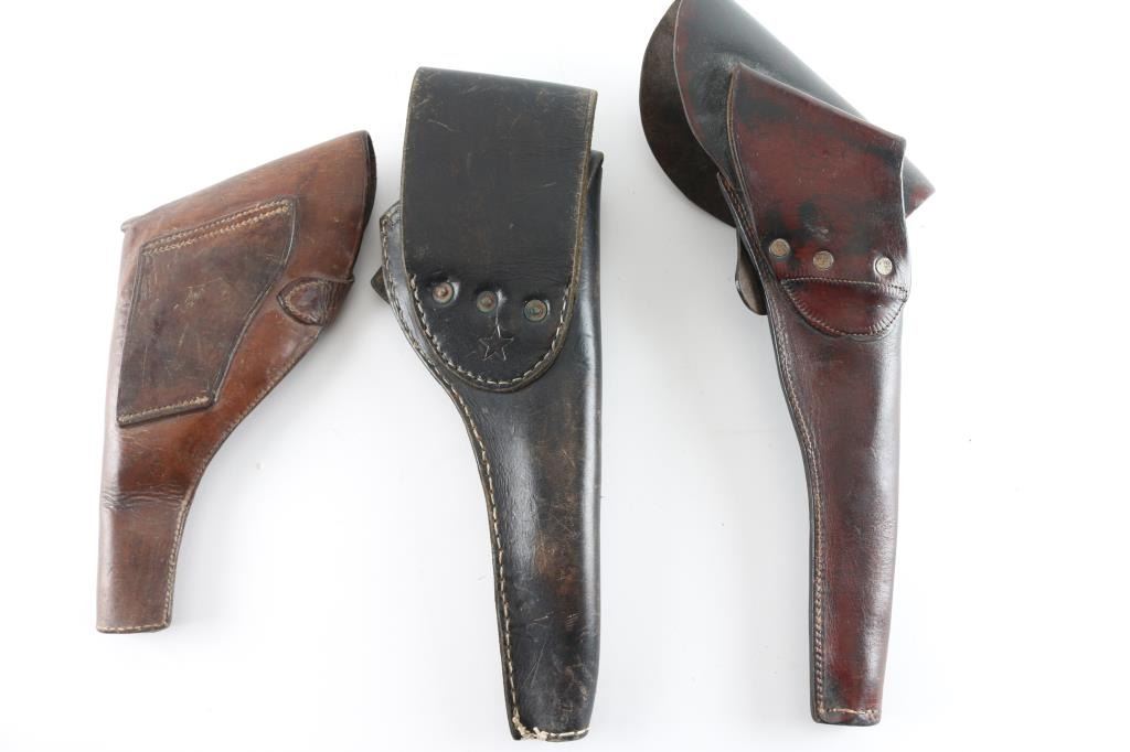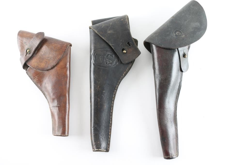 Three total. 1) Black leather M1881 for 71/2" Colt SAA, with 5-point star stamped on the back of belt loop. 2) Civil war era flap holster for the Colt M1860 Army revolver, Unmarked. 3) Brown leather flap holster for 4" revolver, the type used by the RCMP. All are very well made, intact. From the golden age of Hollywood. From the Joe Musso collection, who had a massive collection of movie props.