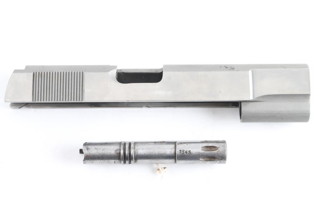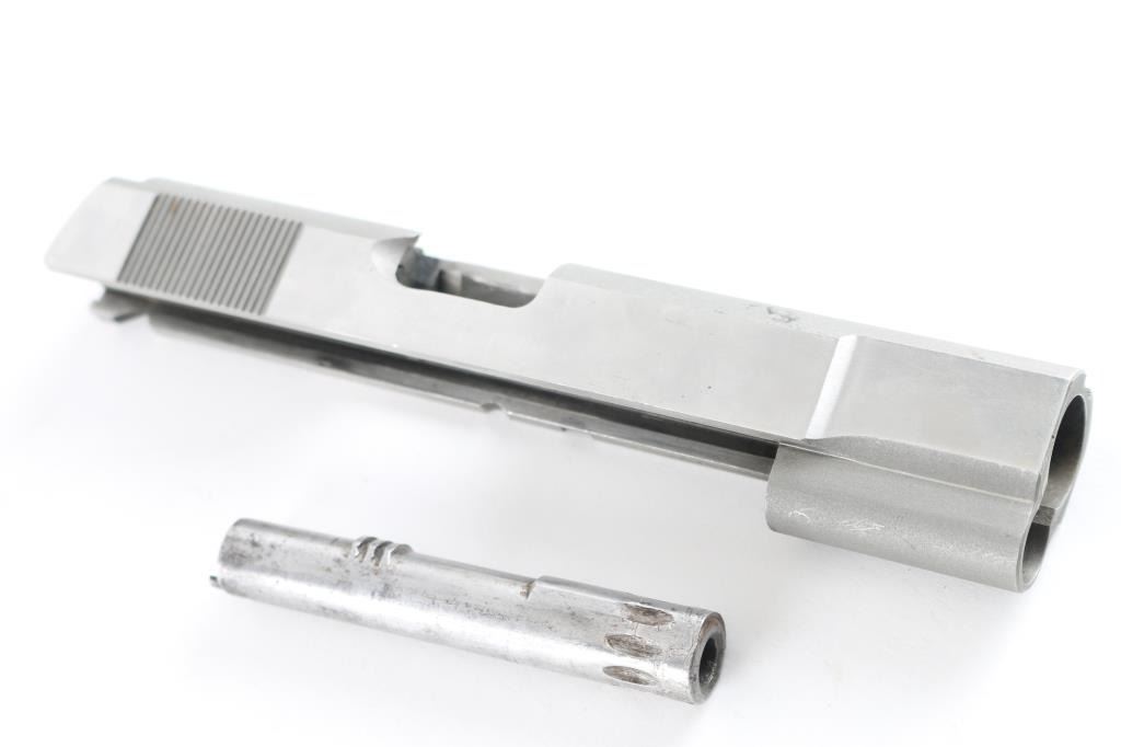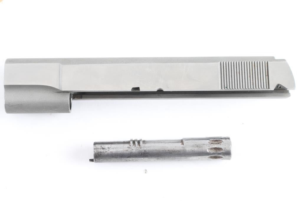 Two Total. 1) Unmarked 1911 .45 Acp slide, matte stainless with polished side, GI Serrations, no sights, has firing pin. 2) .32 Acp Ruby pistol barrel marked "HOPE" (Astra), crown over PG proof, numbered "7545", bore id fair, good rifling with scattered light pin-prick pitting,