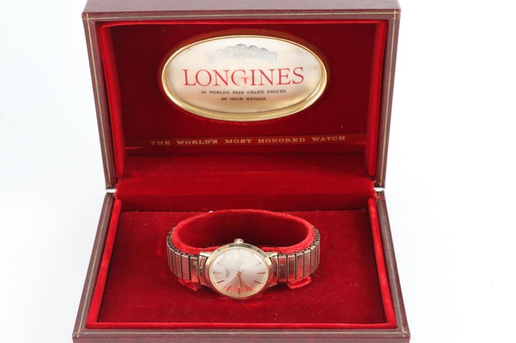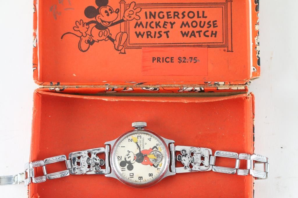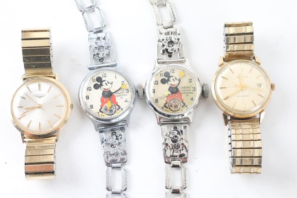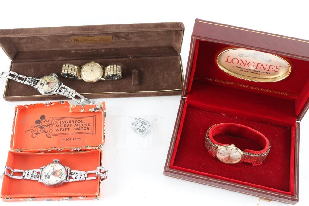 including two antique Mickey Mouse watches, one original box, a Longines watch with a stretch band, in original box and a Bulova watch with a stretch band. All in fair condition. Unknown working condition.