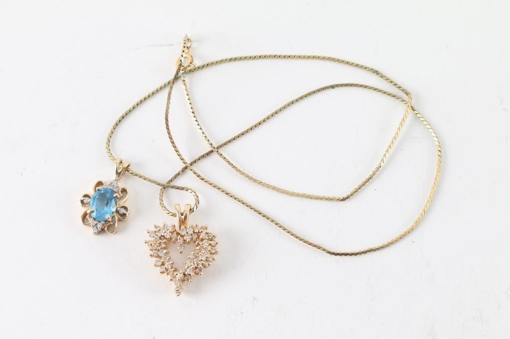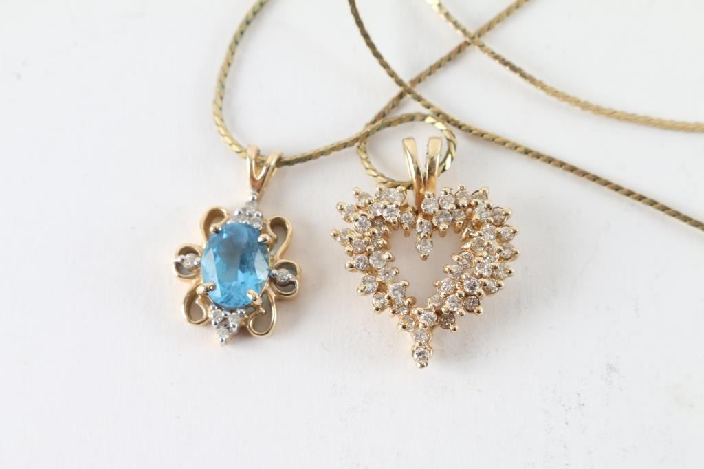 on chains, includes a diamond and 14K yellow gold heart pendant, and a ladies blue topaz also set in 14K yellow gold and a yellow gold filled chain.