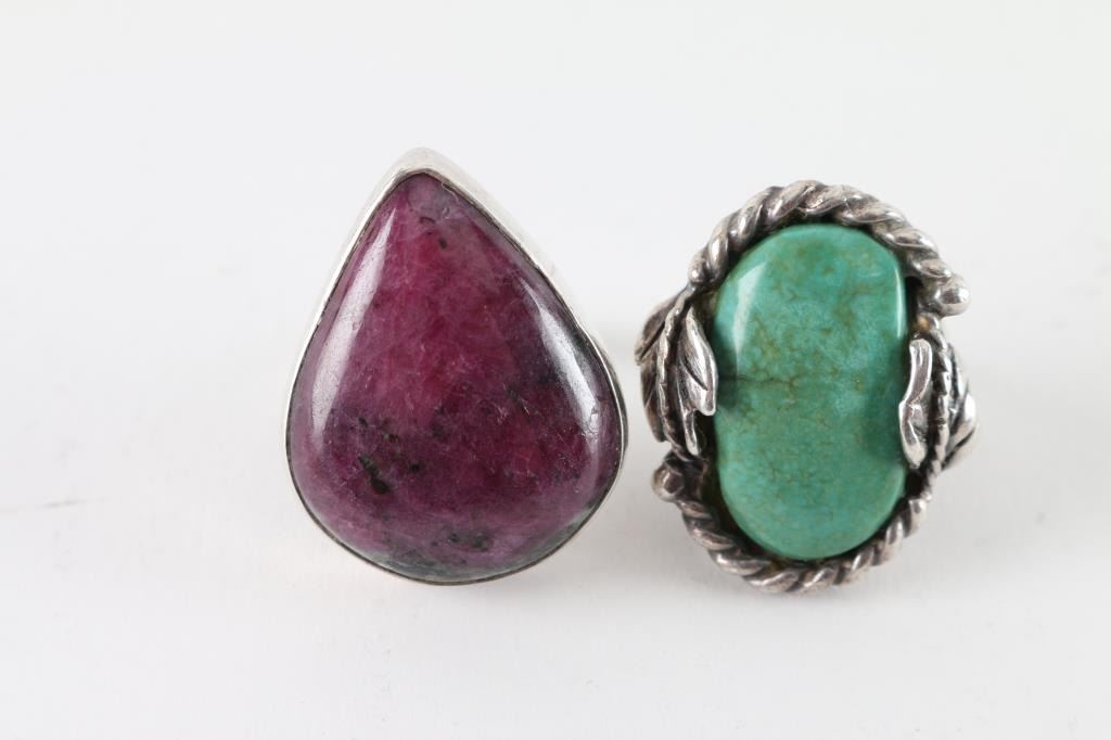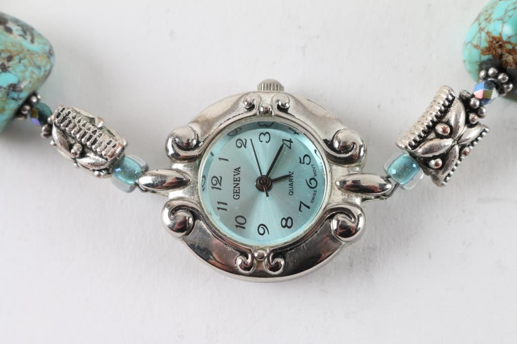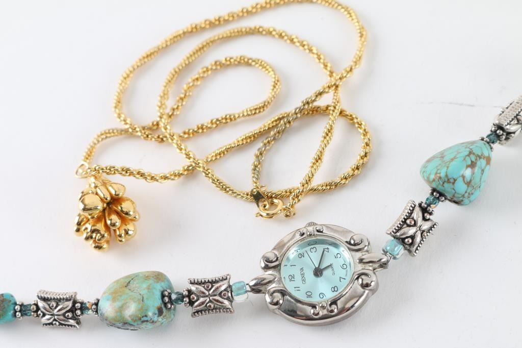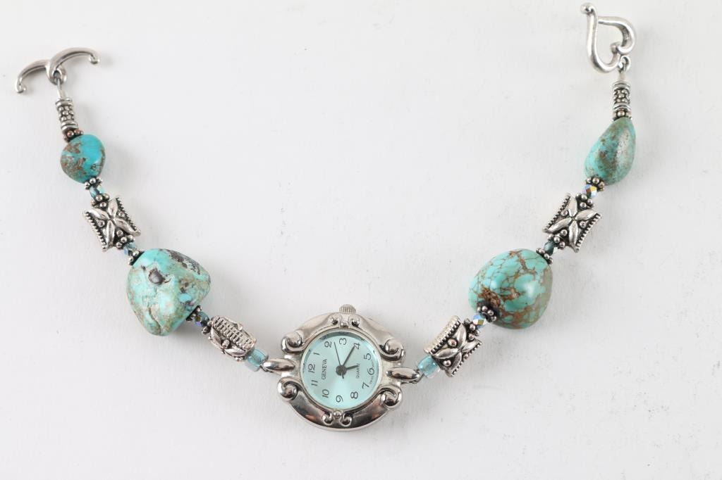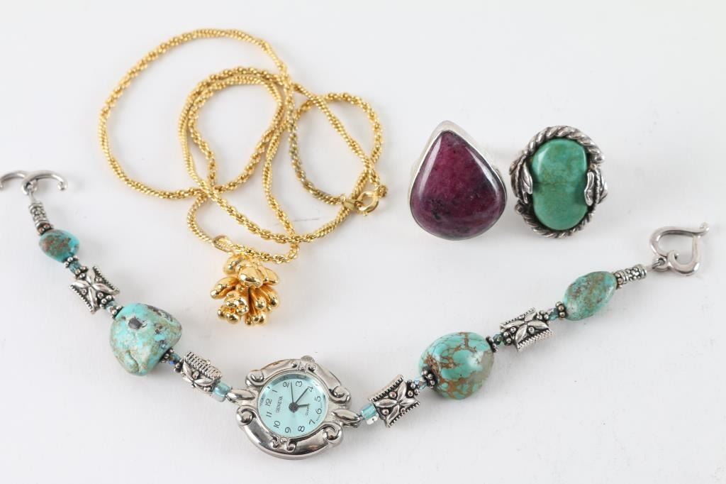 includes Sugalite and sterling ring, a turquoise and sterling ring, a gold plated nugget and chain, and a Geneva wrist watch with beaded band.