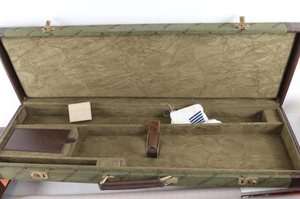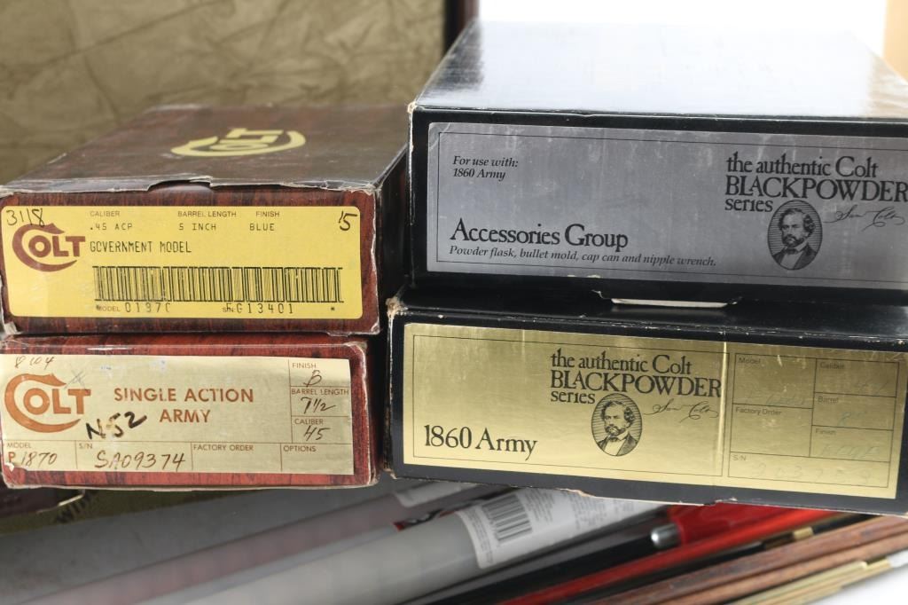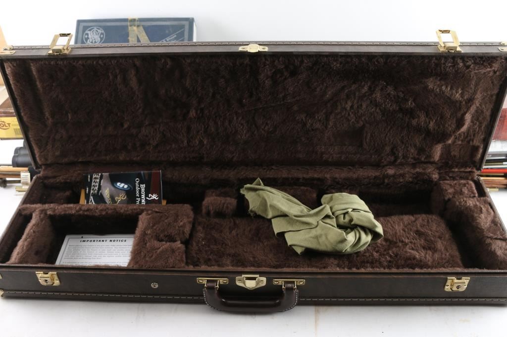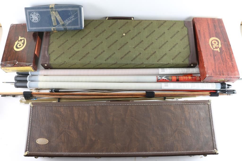 Winchester Shotgun case for a single barreled shotgun, and a factory Browning shotgun case for a single barreled shotgun, several metal, and wooden cleaning rods, and five handgun boxes (Colt & S&W).