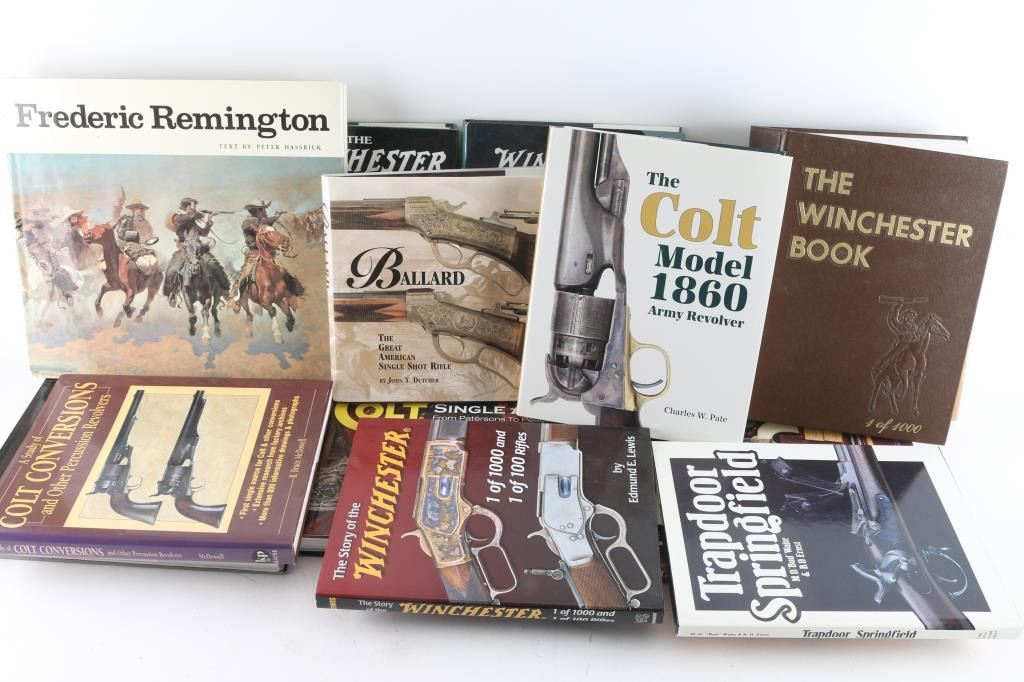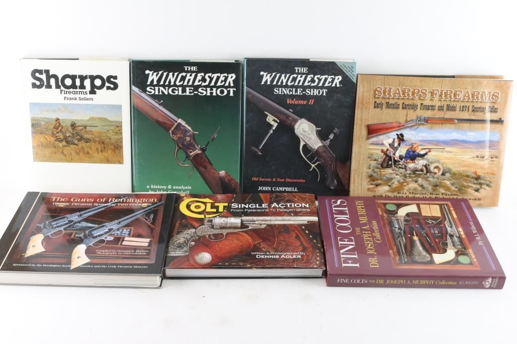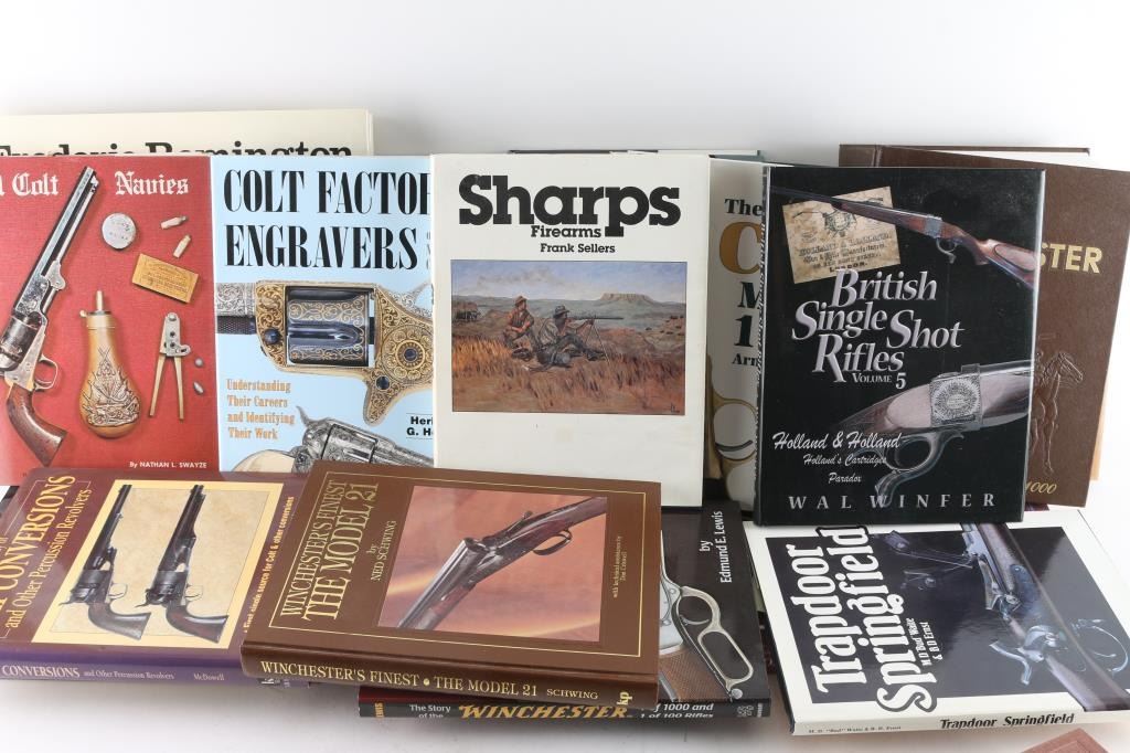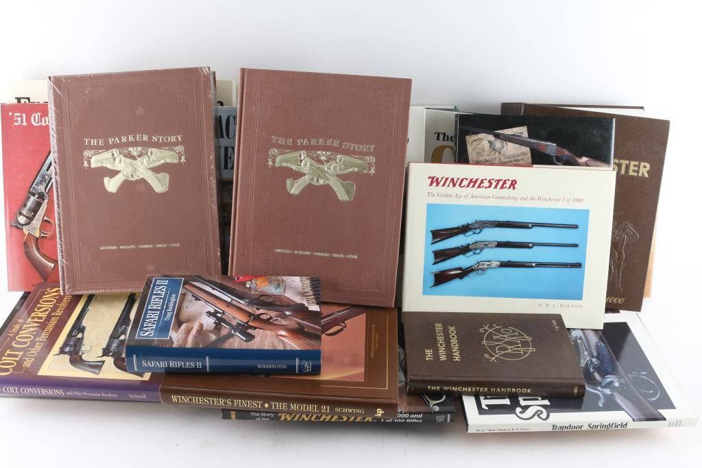 including The Guns of Remington, by Madaus, Colt Single Action, by Adler, Sharps Firearms, by Sellers, Winchester Single Shot, by Campbell, Sharps Firearms, by Paxton, Ballard, by Dutcher, The Winchester Book, by Madis, signed by author, The Parker Story, Volumes I and II, by Cote, and much more! A very fine collector's library.