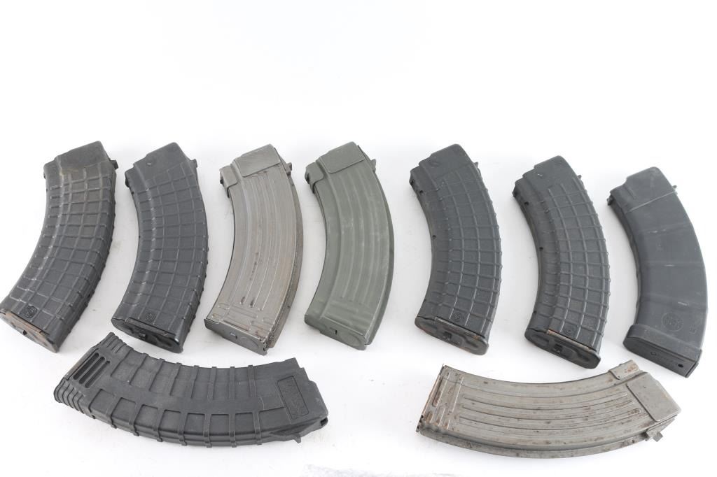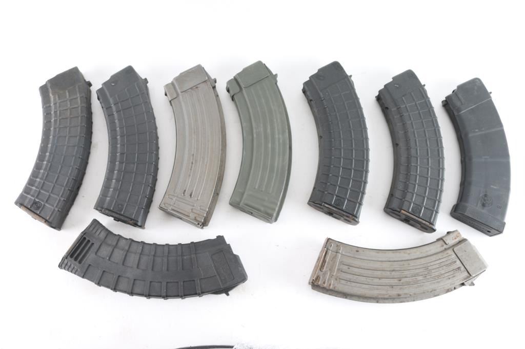 9 total. 4 Bulgarian polymer 30 round; 3 gray steel "Fin-back" 30 round; 1 Tapco polymer 30 round & 1 Thermold polymer 30 round. All 7.62 X 39mm.