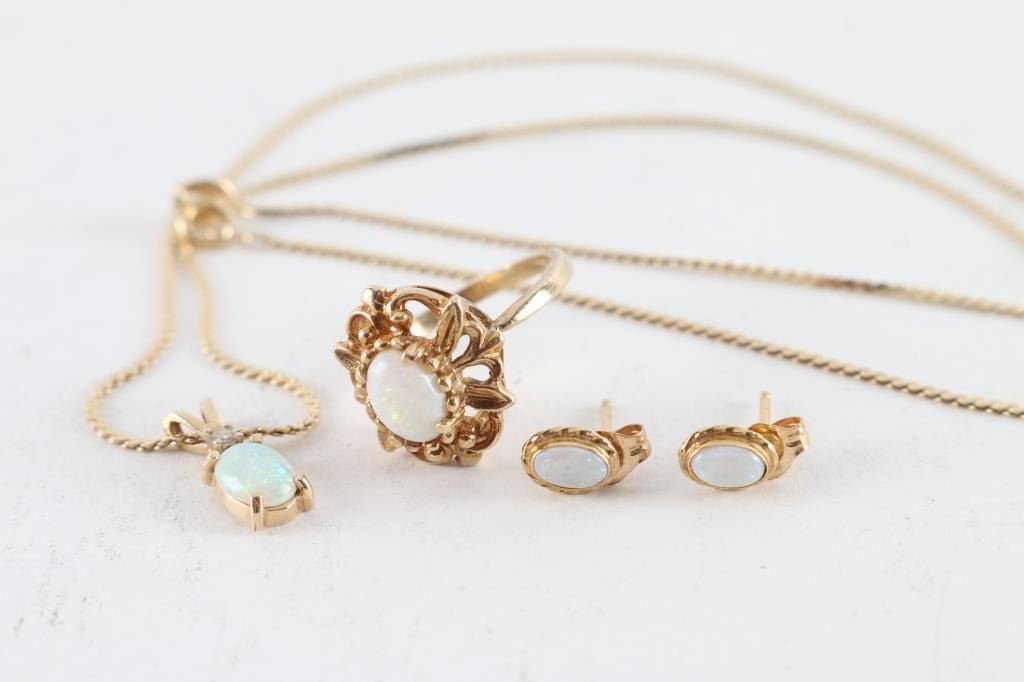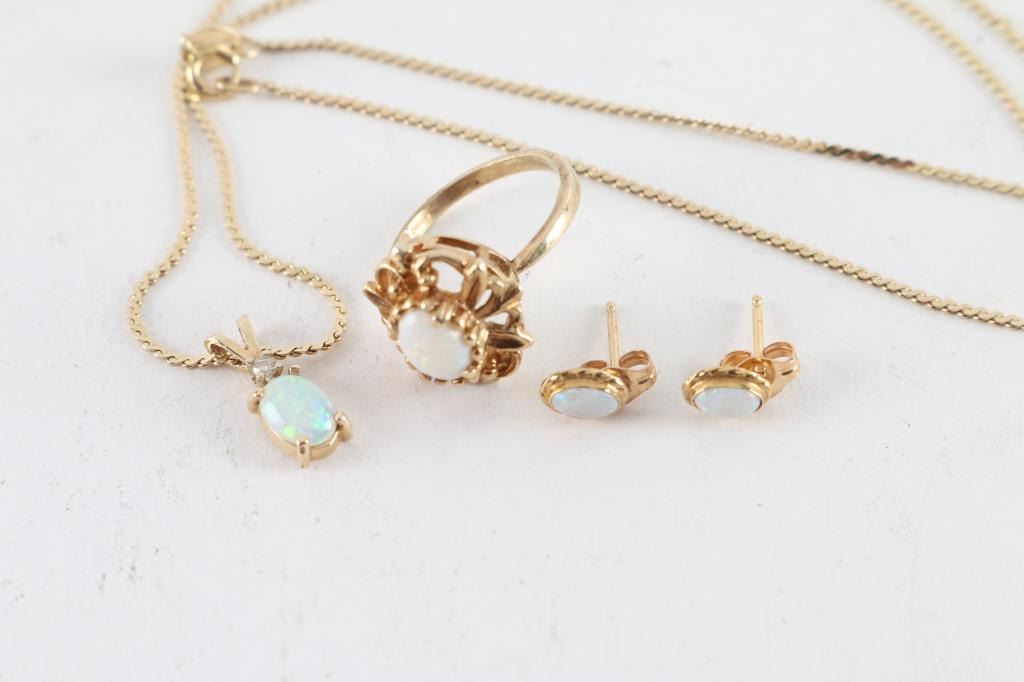 Includes A Ring, Size 3 1/2, A Opal Pendant And Chain, Stud Earrings, All Yellow Gold.