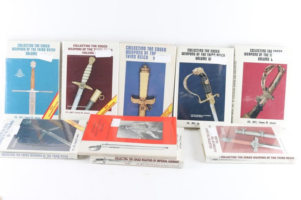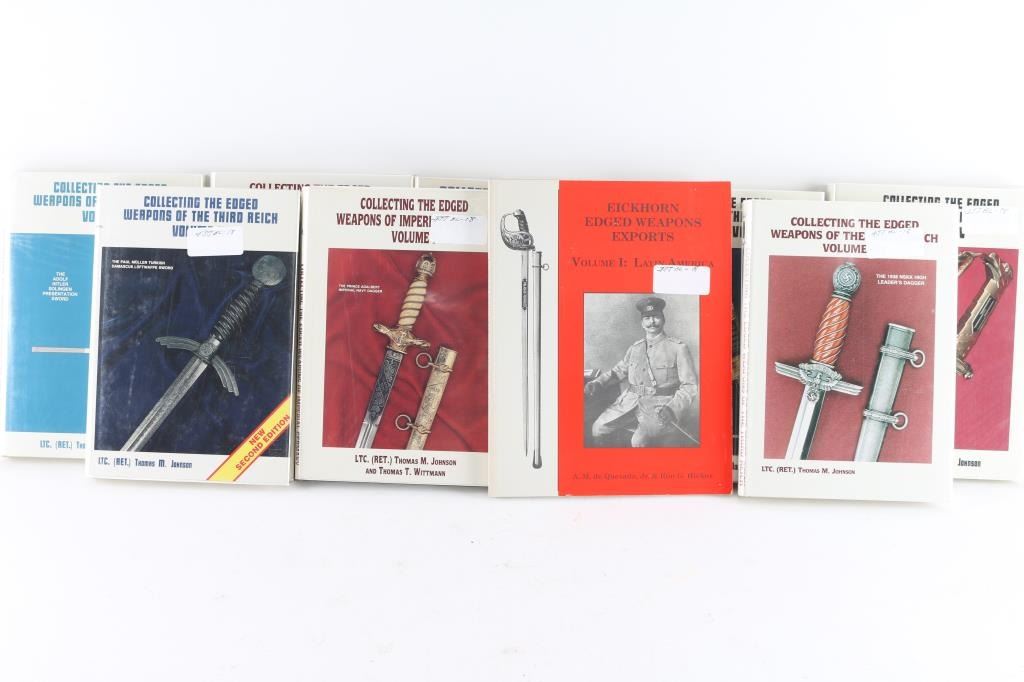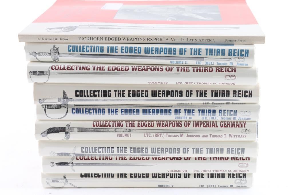 This lot includes 7 editions by Thomas M. Johnson on "Collecting the Edged Weapons of the Third Reich", (Volumes, I, II, III, IV, V, VI, VII), along with "Collecting the Edged Weapons of Imperial Germany", by LTC. (Ret.) Thomas M. Johnson and Thomas T. Wittmann, (Volume I) and a softbound book, Eickhorn Edged Weapons Exports" Volume I: Latin America by de Quesada & Hickox. All in very good condition.