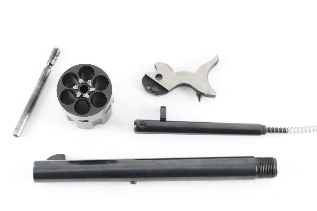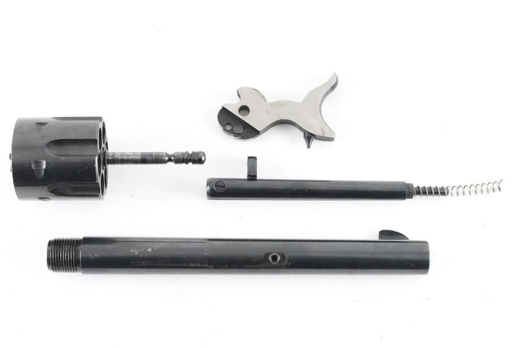 including a Colt 7 1/2" barrel, cylinder, base pin and bushing, and ejector rod, housing and rod spring, with polished side correct to Pre-War 45 Colt caliber single action era hammer. Appears to have never been mounted on Colt or used. Probably new-old stock, sold by factory, as replacement parts. A stunning group circa 1930's to 1940's that would "make" the right single action.