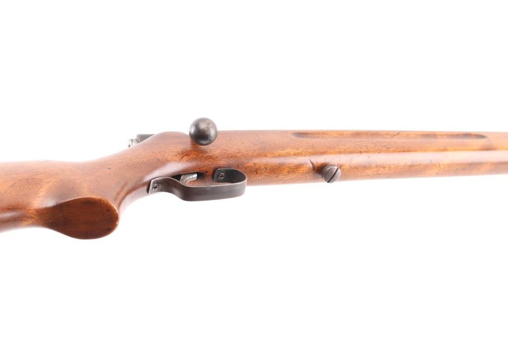 Wards Western Field No. 47 .22 bolt action rifle. These rifles were manufactured by Mossberg & Sons under the model 45A. This No. 47 is chambered in .22 short, long and long rifle and utilizes a 24” round barrel with tubular magazine underneath. The top of the barrel is stamped “Wards Western Field No. 47 S-L-LR Pat. Pend.” Manual safety, cocking indicator. The one piece hardwood stock shows good condition with light scratches. Bore is excellent/bright. Blue is about 85%. Great starter rifle. NRA Condition-Very Good. C&R Firearm.