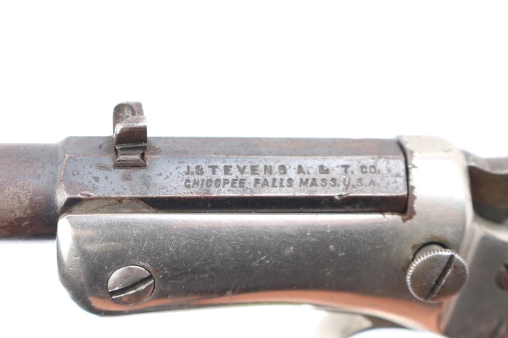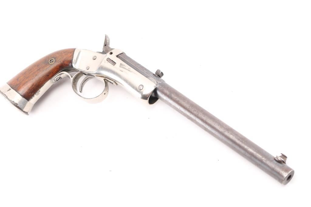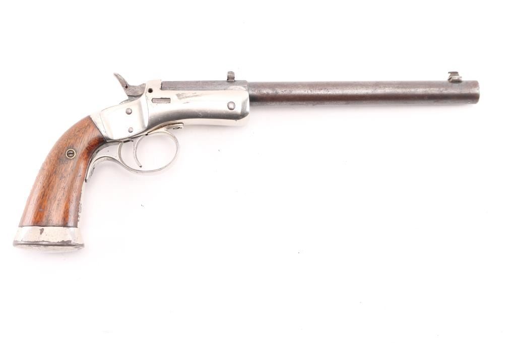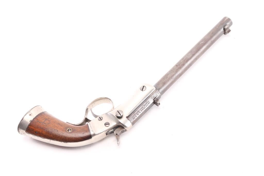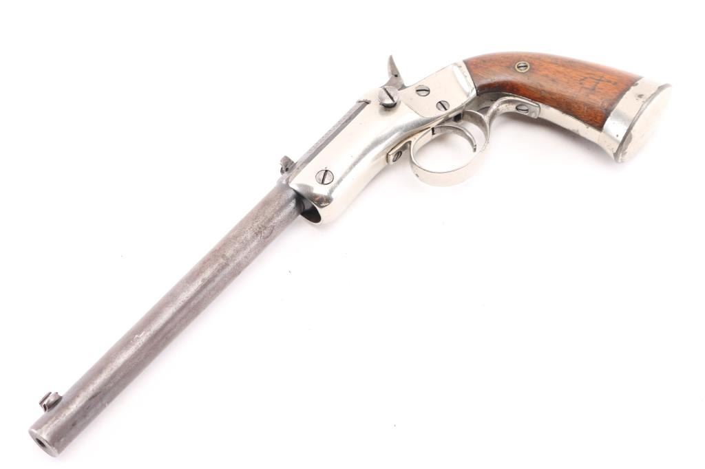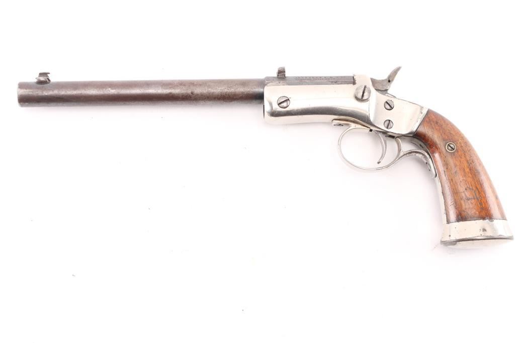 Vintage American made single shot rimfire pistol manufactured circa 1907-1916. Features a blued 8" part octagon/part round tip-up barrel, automatic extractor, dovetailed blade front sight, dovetailed rear notch sight, smooth trigger, cast metal triggerguard, smooth hammer spur (traces of knurling), nickel plated iron frame with weighted & flared butt cap, and two-piece smooth walnut grips. Matching serial numbers are found on the barrel & frame, pencilled on inside of grip panels. Bore is poor, dark and lightly pitted throughout, with traces of visible rifling. Barrel is mottled brown patina with mostly smooth texture, some slight roughness. Nickel on frame is good, showing some peeling and puckering, majority coverage of bright silver color. Grips are very good, showing small dents, slight shrinkage, 3/4" high "A" lightly carved into left panel. Action needs repair, hammer does not stay cocked. Missing firing pin, with slight burr or weld blob protruding from breech face. Condition is NRA Fair (needs repair to action) *** C&R Firearm ***
