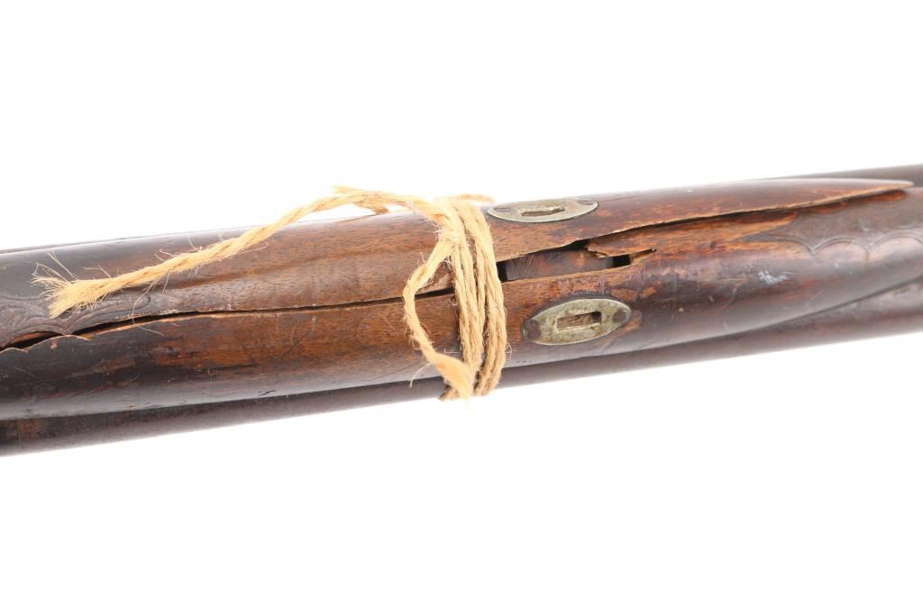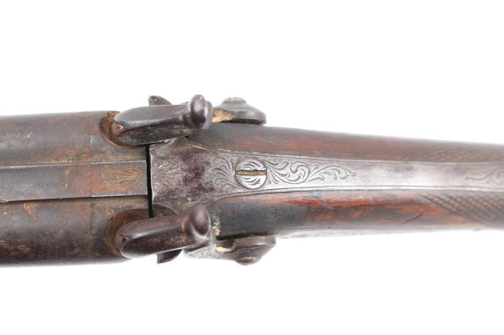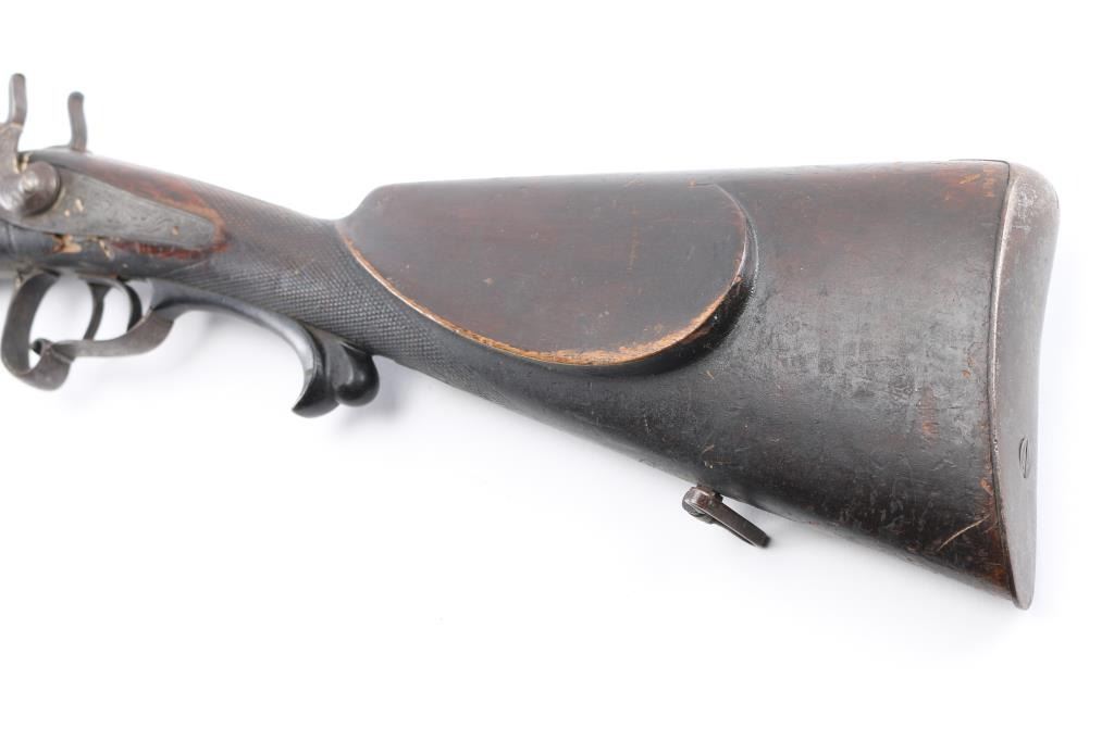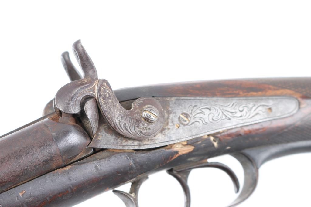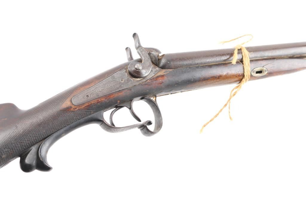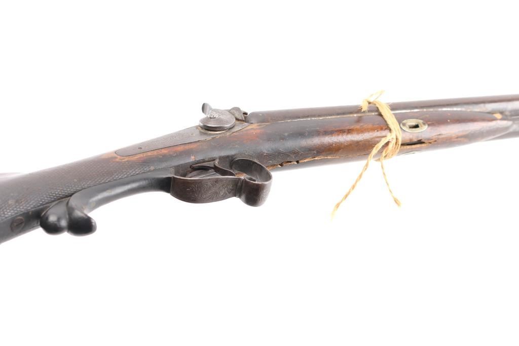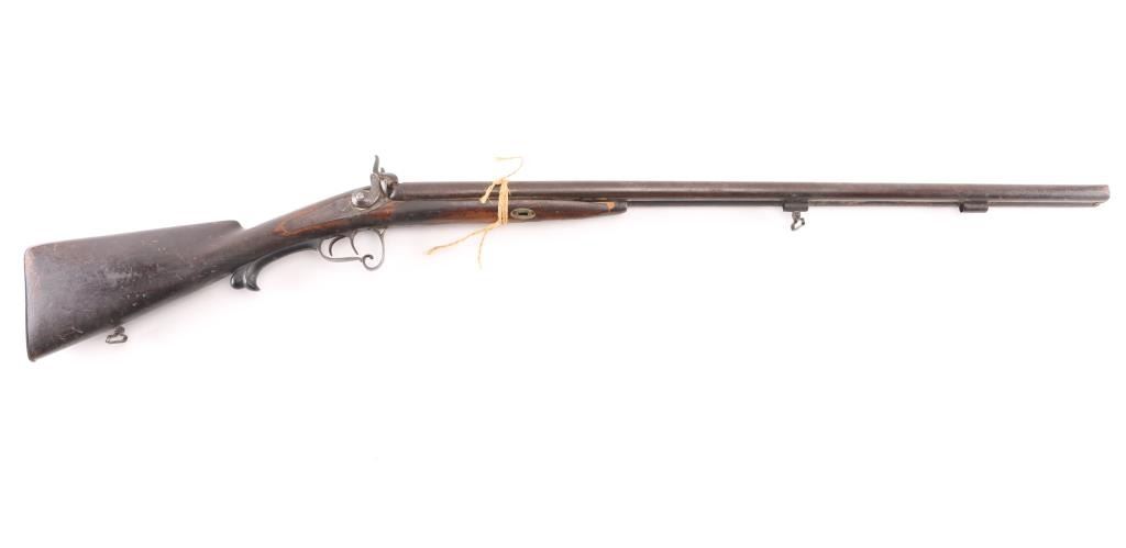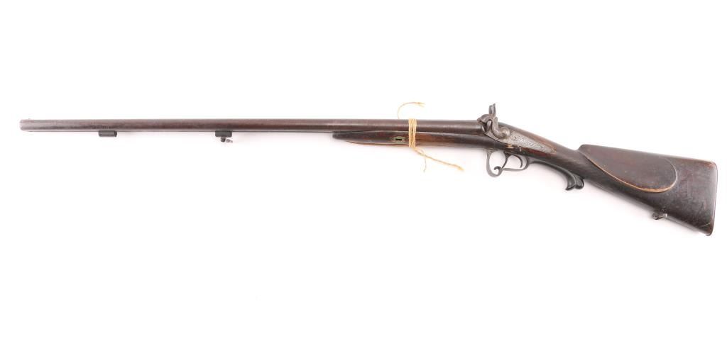 Unsigned antique percussion shotgun. exposed hammers, double triggers. 30" barrels. Fancy triggerguard, shadow line cheek rest. Gun is in relic condition, right bore is dented, missing cleaning rod, the fore stock has split in two. Hammer action works well. With the stock glued would make a decent wall hanger.