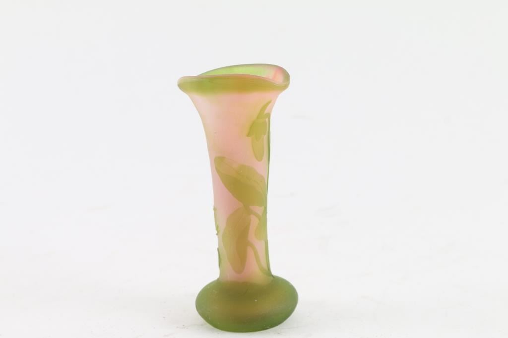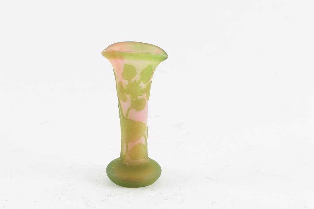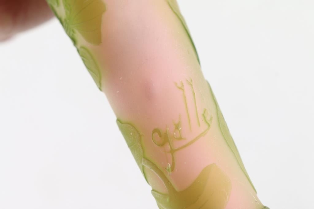 Vintage Glass art design vase is signed Galle' , ~ 3.75" tall. Green on pink.