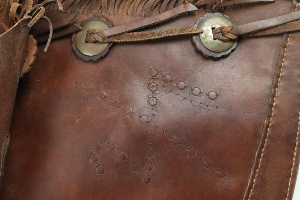 (1) Round, light brown, fringed chinks [no maker marking] and (2) Brown, shotgun chaps with fringe and pockets [no maker marking].