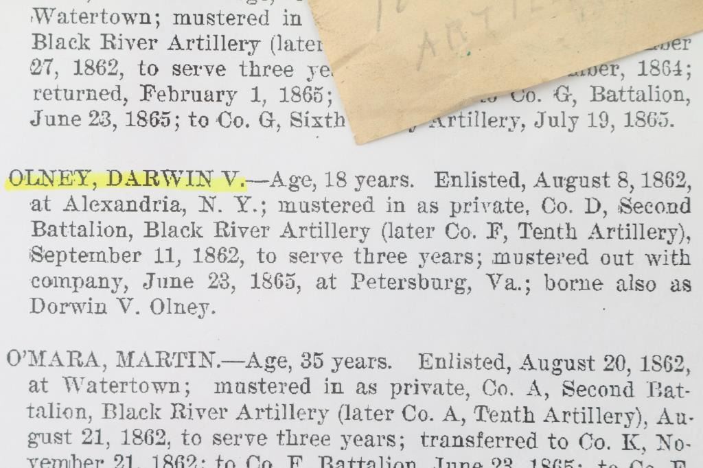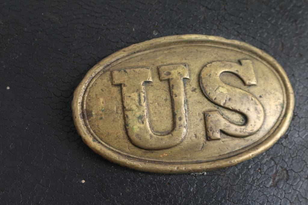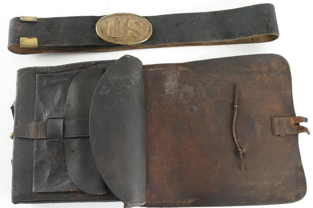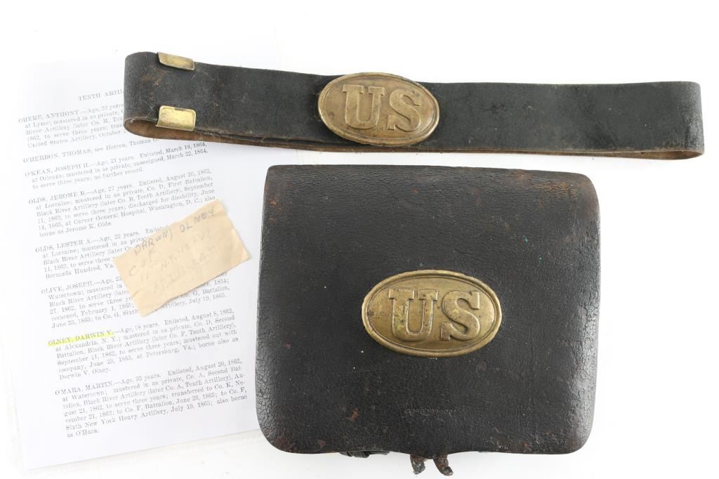Two Items total. Original Civil War era. 1) Identified 1861 pattern black leather Cartridge box with brass "U.S." plate. held 40 .58 caliber cartridges for the Springfield rifle. has all 4 tins, no shoulder strap, overall good/sound condition, but the closure loop is broken. One of the tins contained a very old piece of paper with "Co. F 10th N.Y. Heavy Artillery" written in pencil, above is the name Darwin Olney written in pen, which was most likely written at a later date by a relative. We researched the muster rolls and indeed Pvt. Olney served 3 years, 1862-65, in this unit. Copy of his service history is provided, along with the paper, Also included in the lot is a Enlisted infantryman's belt equipped with Model 1839 "US" belt plate. The leather belt is attached to a die-struck rolled brass Model 1839 "US" plate lead filled with arrow belt hooks. brass belt keeper attached. very good condition. This lot came together from a collector in Ohio.