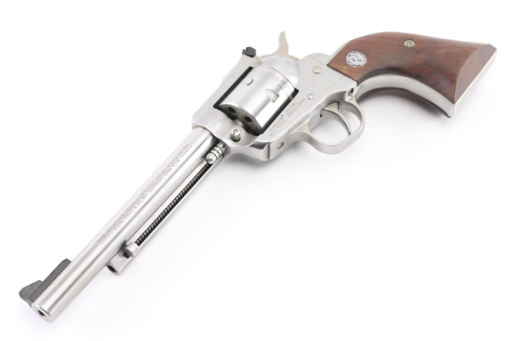 American made stainless steel medium frame western style single action 6-shot revolver with a .22 Win. Mag. cylinder circa 1973. Features a satin finish, 5 1/2" barrel, black serrated ramp front sight, fully-adjustable rear sight, smooth trigger, serrated hammer spur, transfer bar safety, fluted six-shot .22 Win Mag cylinder with recessed chambers, ejector rod with flat faced button and smooth brown laminated wood grips with silver & black Ruger medallions. Bore and chambers are excellent but a little dirty. Comes with a leather Guide Gear belt and RH leather holster. Condition is NRA Excellent. ***Modern Firearm***
