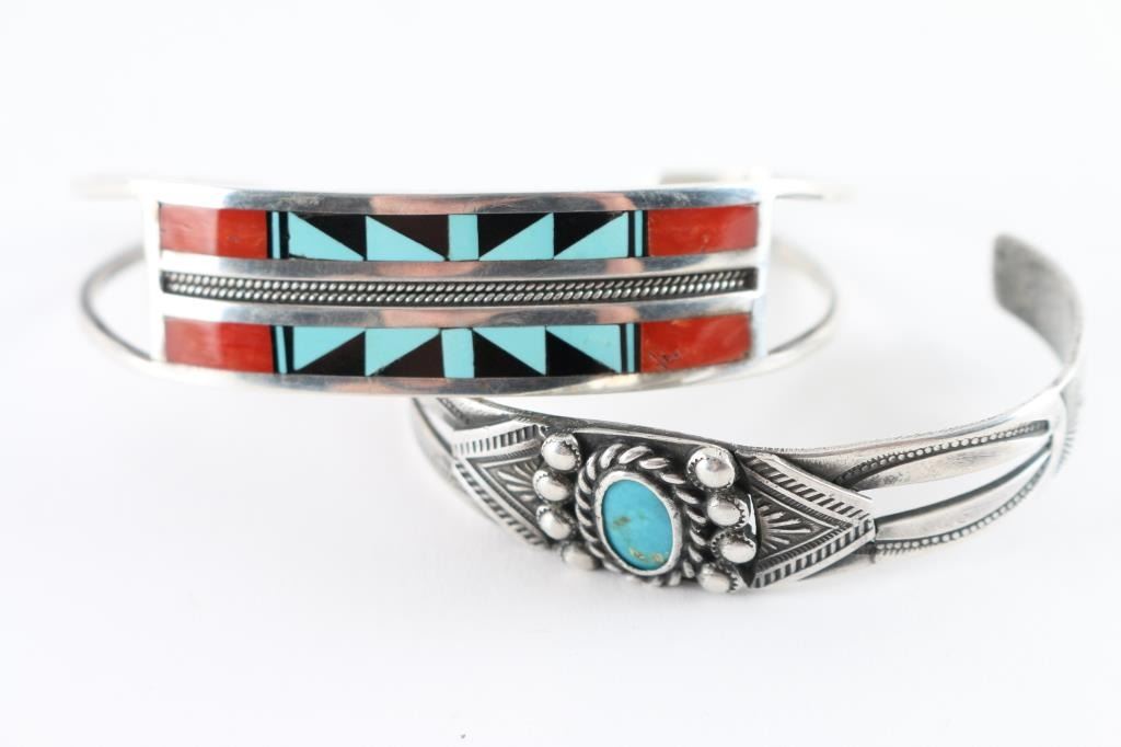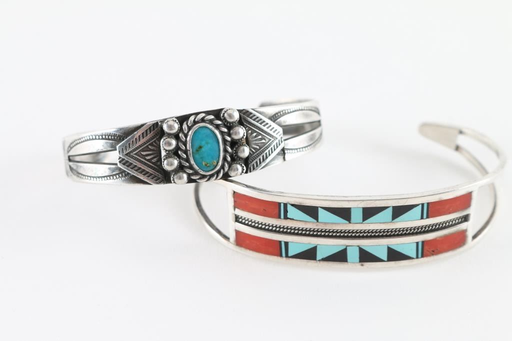 (1) Fred Harvey Style turquoise cuff (1) Multistone Zuni Cudd marked Rachel T Zuni, inlaid with coral turquoise and jet set in sterling