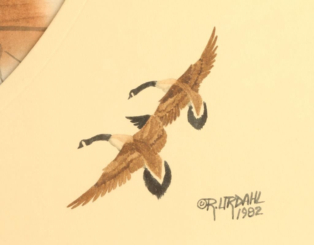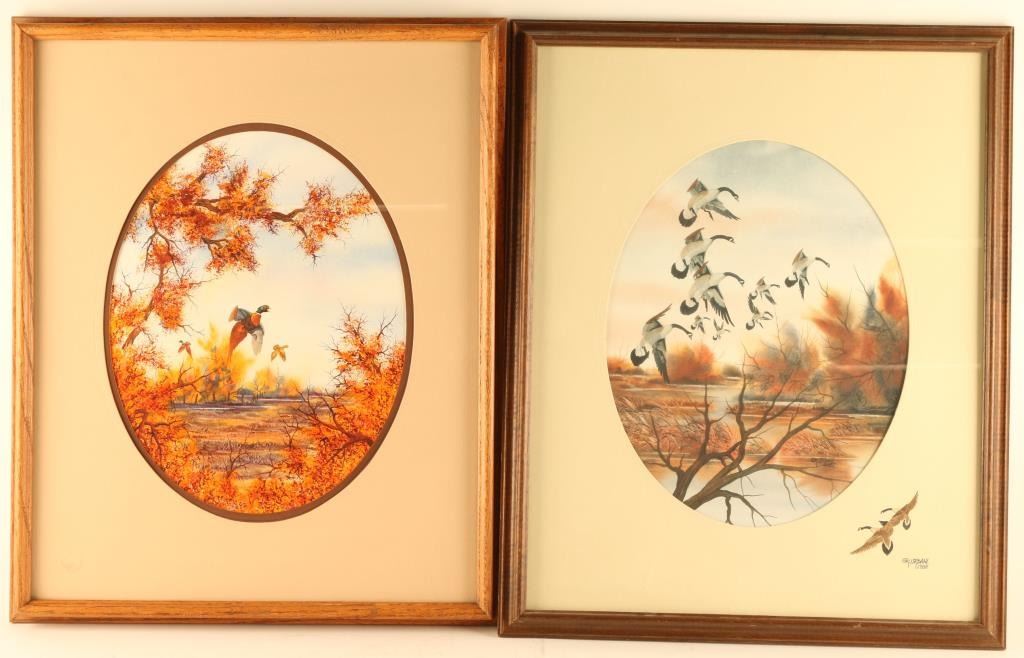#1) Original Gouache By R.Urdahl depicting Geese in fall, signed lower right an framed on paper with artist remark lower right. Measuring 20"X17" #2) Original Gouache on paper depicting pheasants flying with signed signature under framed. Both in wood frames with Oval matting. Measuring 21"X17"