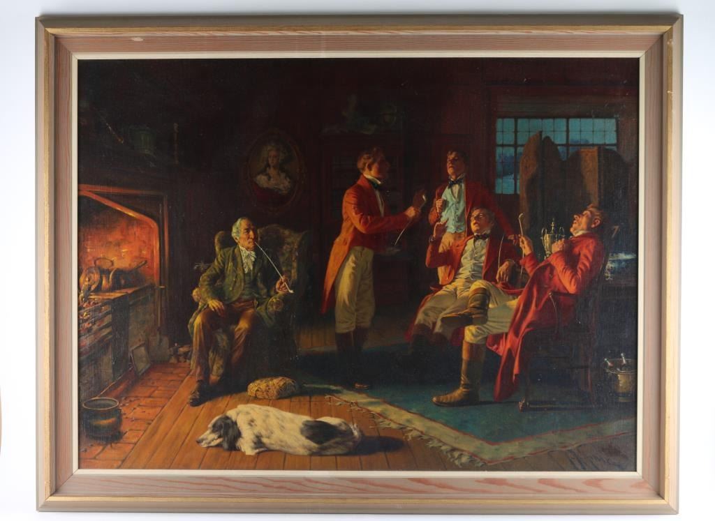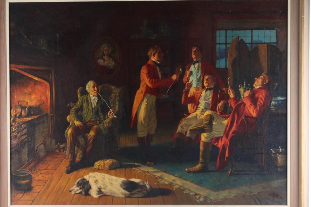 of five English Gentlemen with dog in front of fireplace. The print measures 39x28.5". The frame measurements are 45" x 35". The frame has minor scuffs and gouges. Minor damage to the paper backing. Overall good condition.