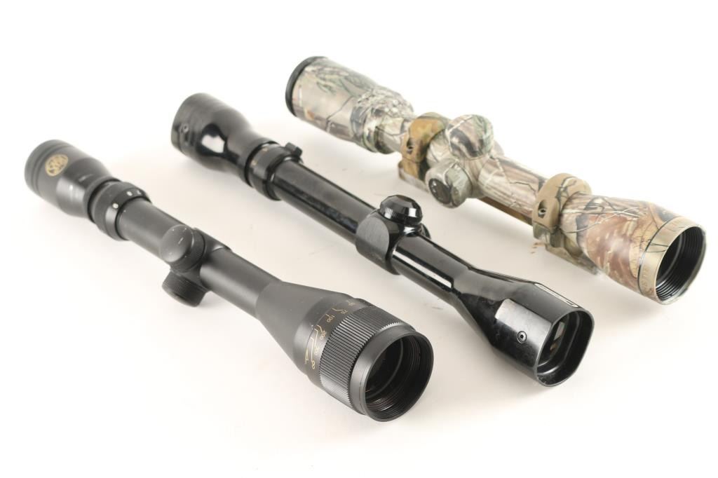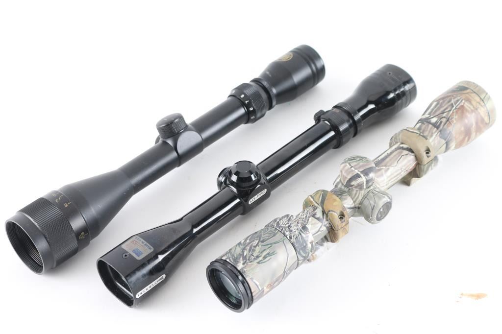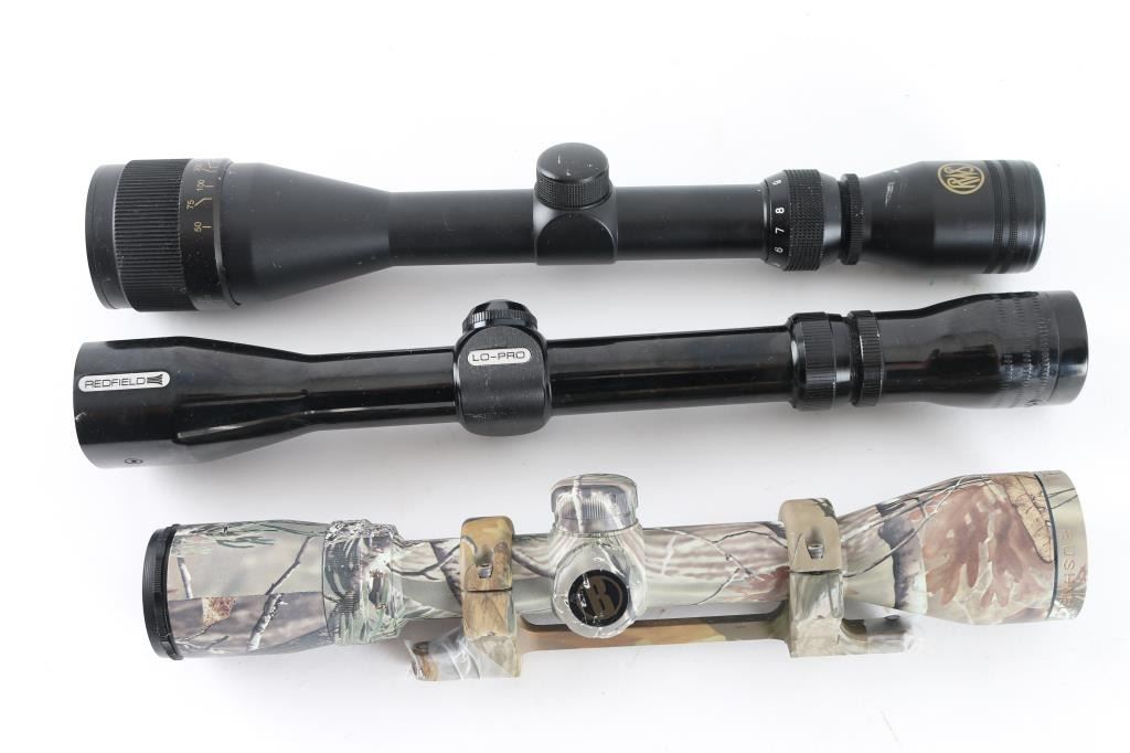 1) Redfield Lo-Pro Duplex Reticle 1-Inch Tube Riflescope. with rubber lens caps. Clear optics, very good condition. 2) Bushnell Banner 3-9x40 Ap Camo with rings/Rail, Very good condition. 3) RWS 4x32 mm air rifle scope, Very Good with some minor scratches.
