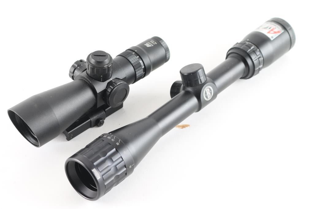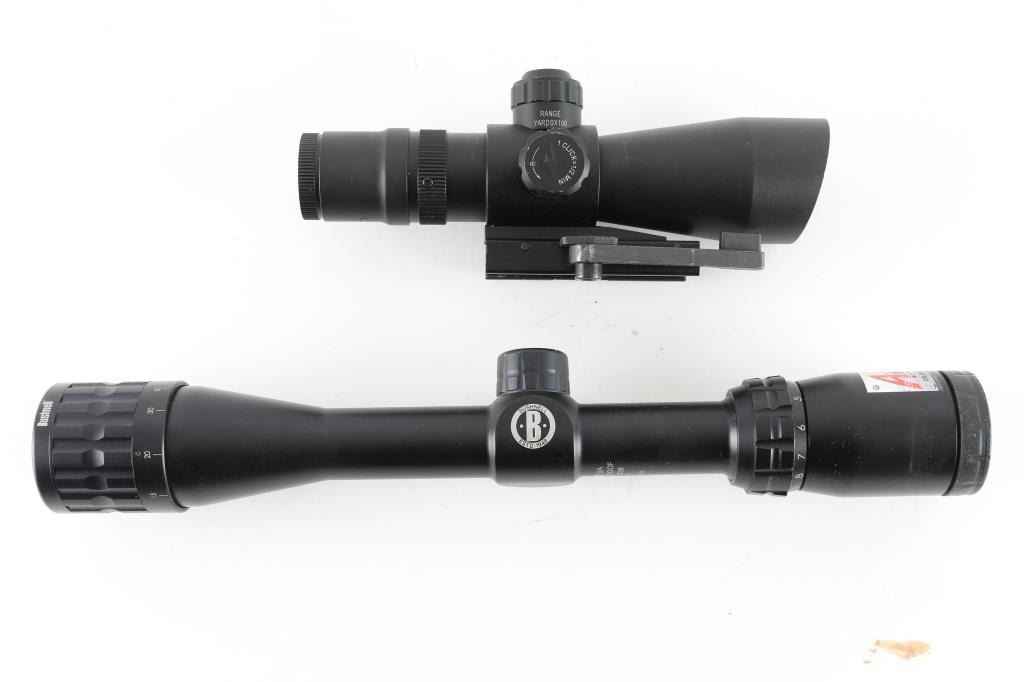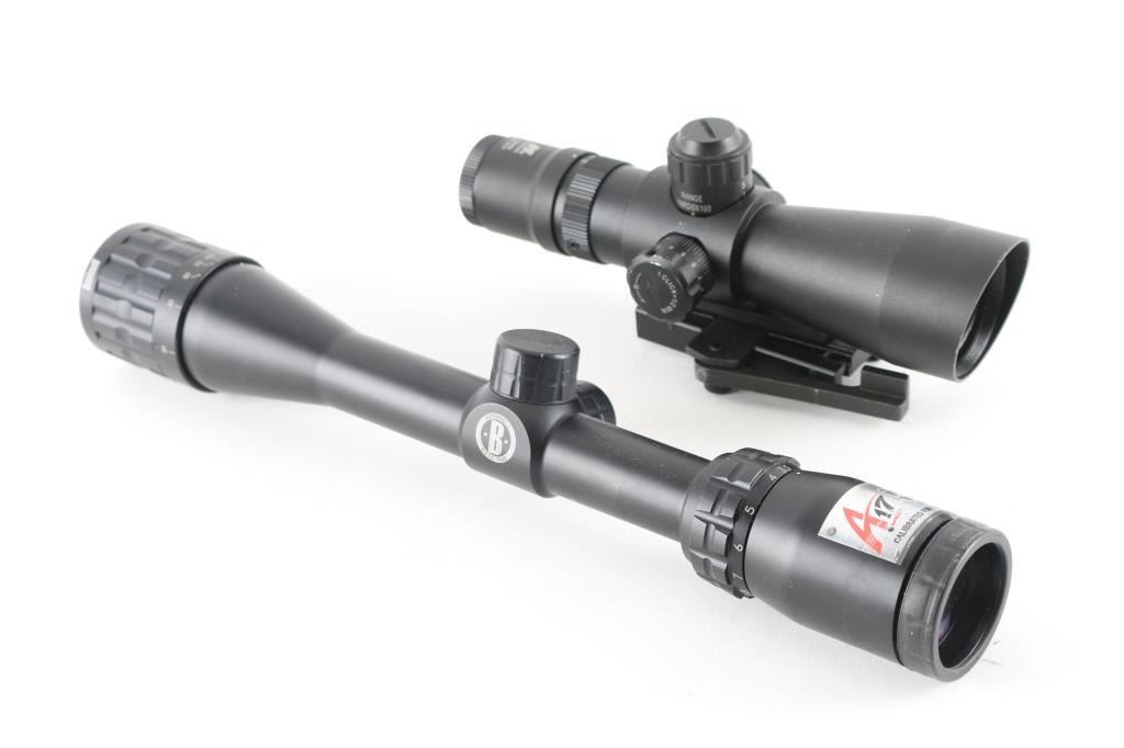 1) Bushnell Rimfire Optics A17 Rifle Scope 3.5-10x 36mm Adjustable Objective 17 HMR BDC Turret Multi-X Reticle Matte. Very good condition. With manual, and lens covers. 2) Ncstar 3-9X42 Mil Dot scope, Integral Quick Detach Base Fits Picatinny Type Mounts Range Estimating Reticle Pattern, Very good Condition, with rubber lens covers.