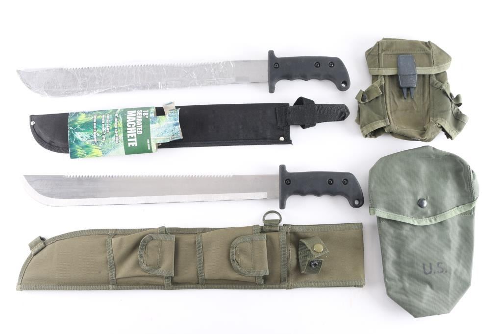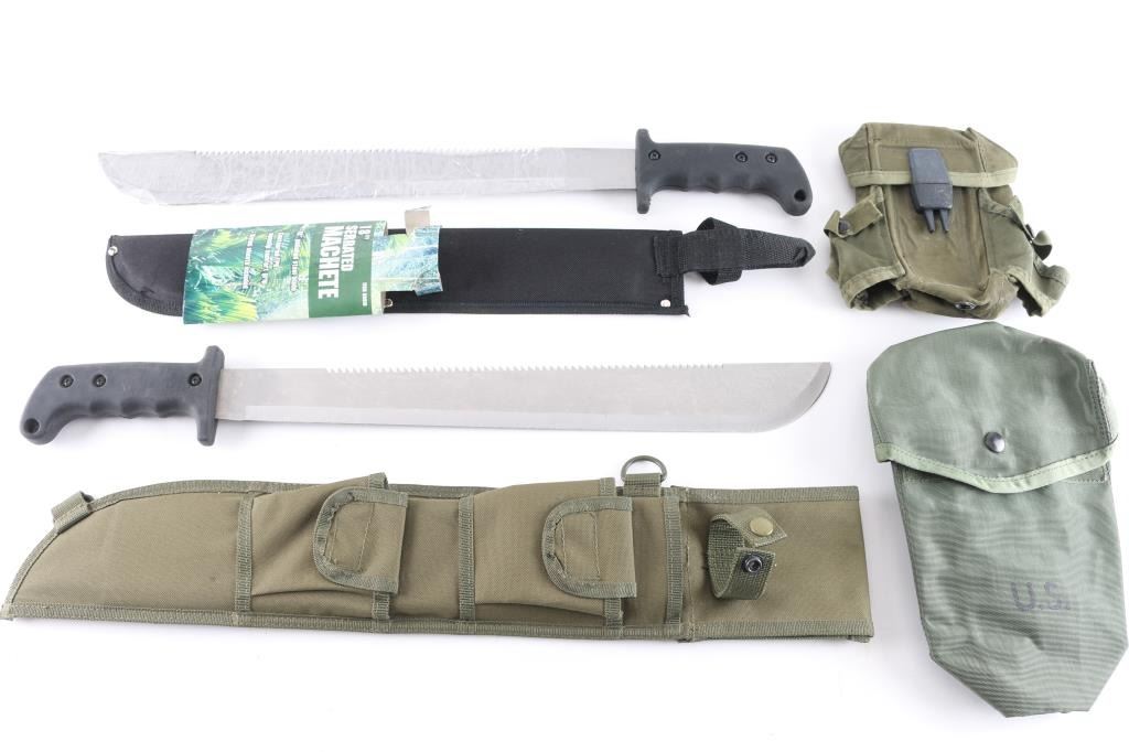 1) Two Harbor Freight machetes, both w/ 18" blades and serrated top edges, 23 5/8" overall. All new in black and green scabbards. 2) Two military pouches, 1 - U.S. M249/SAW soft pouch for 200 Rds, new/unused and 1 - M4 magazine pouch for 3 magazines & 2 grenades, used. Includes 1 - shooting mono-pod.