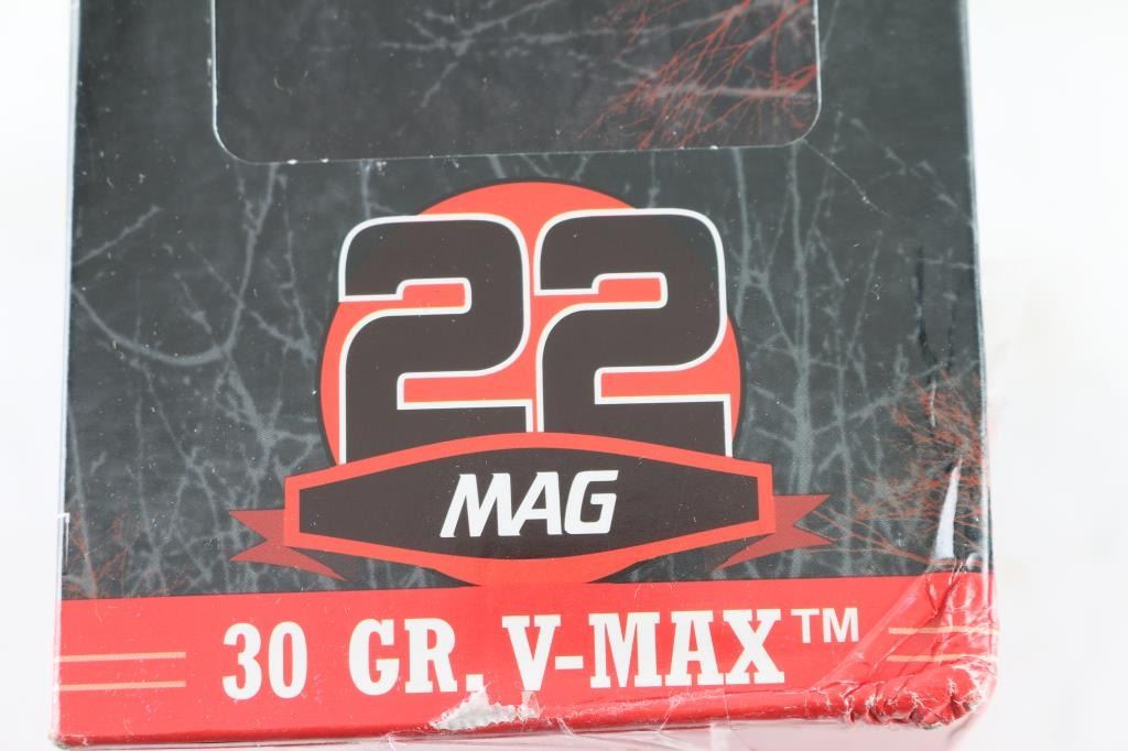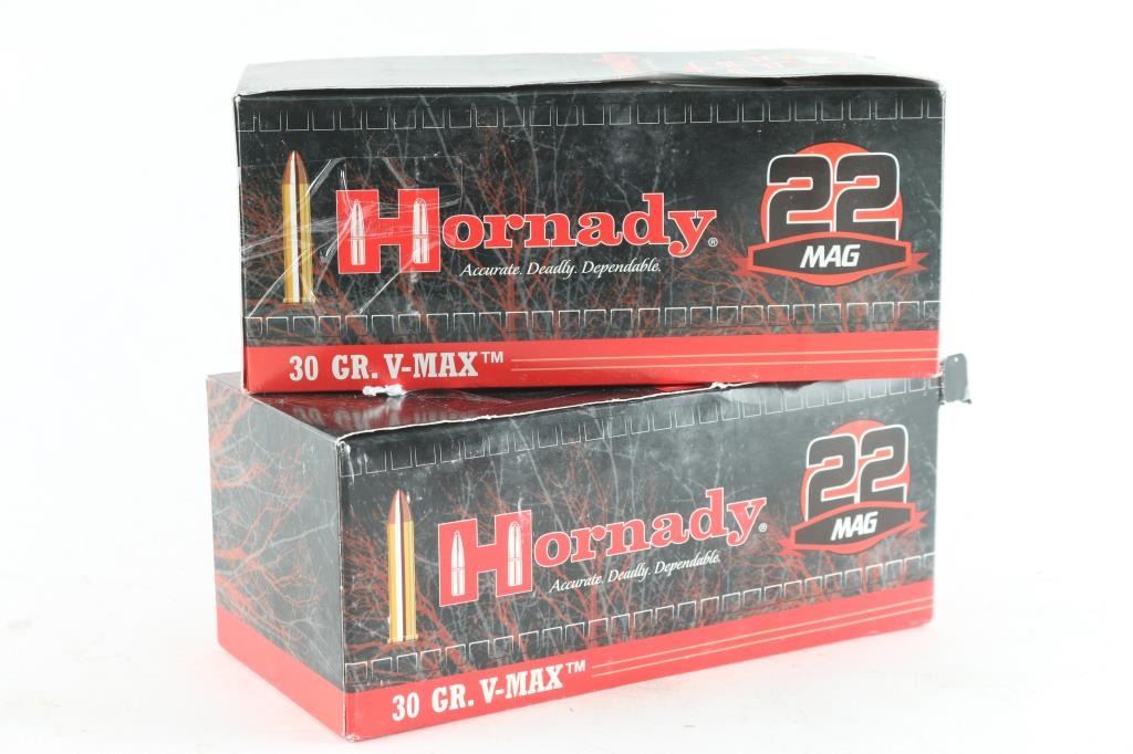 Approx. 1000 rounds of factory new .22 Magnum ammunition. Hornady 30 Gr. V-Max. All in 2 cases.