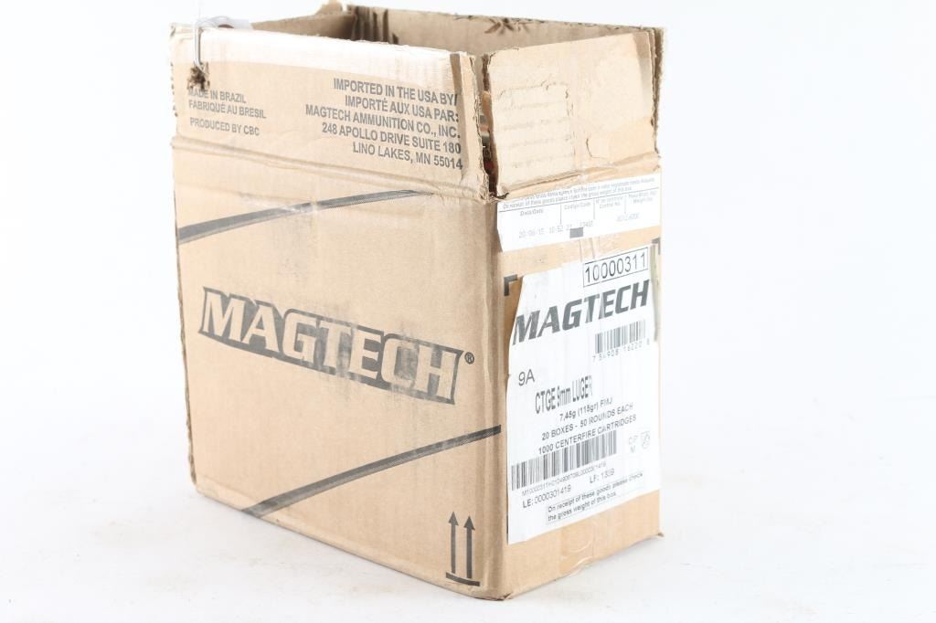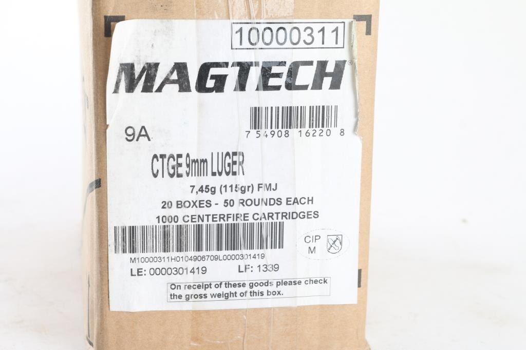 Approx. 1000 rounds of 9mm factory new ammunition. 950 rounds of Magtech 115 Gr. FMJ & 50 rounds of Federal 147 Gr. JHP. All in factory boxes.