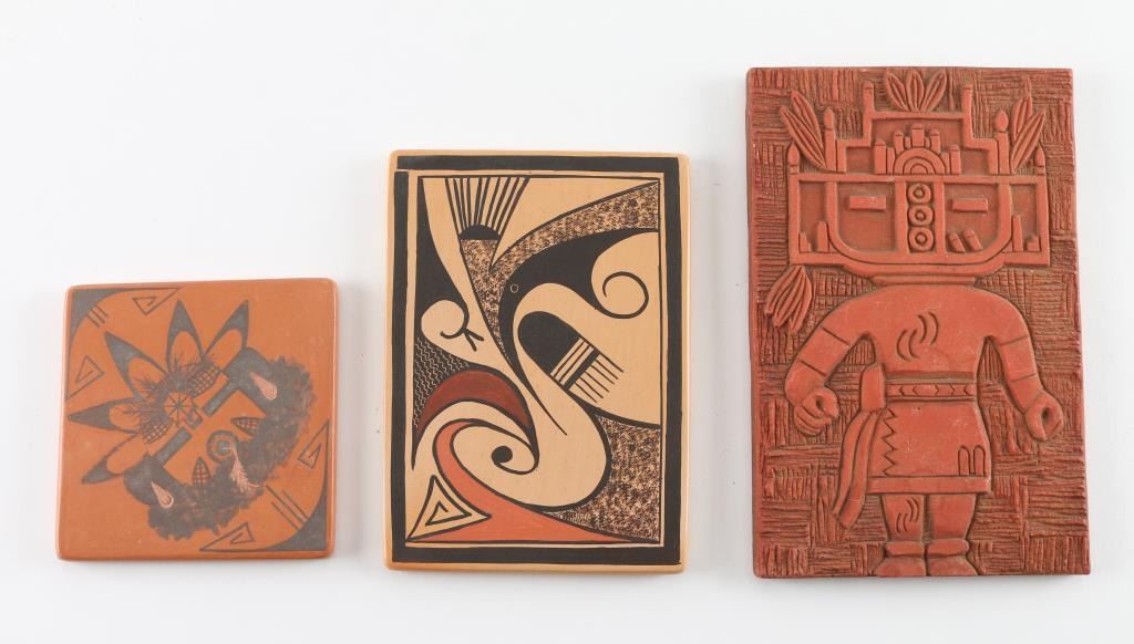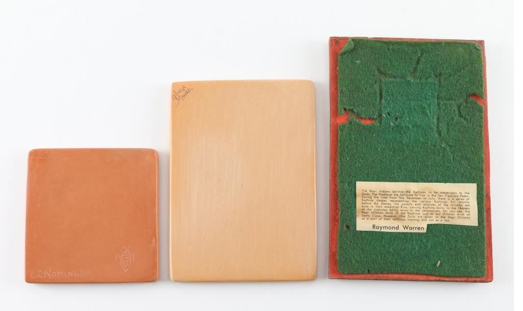 (1) Hopi Kachina Tile by Raymond Warren measures 7"x4.5" (1) Hopi Painted Tile measures 6"x4". (1) Hopi Tile with painted Kachina by L.C. Namingha signed on back 4"x4"
