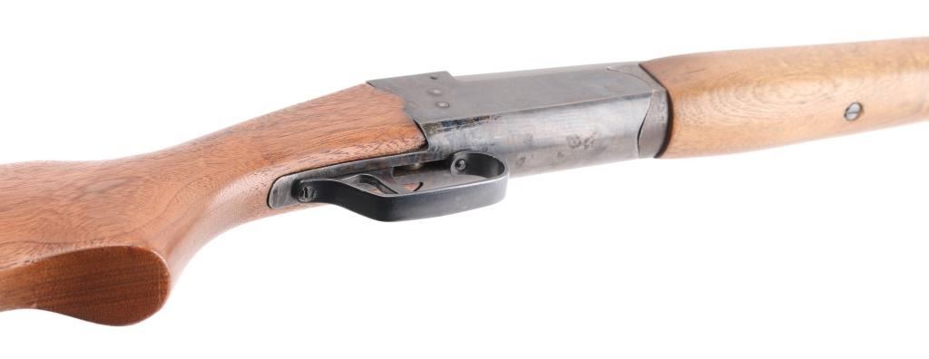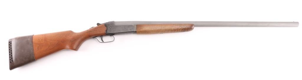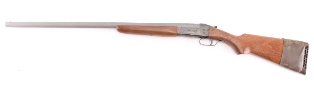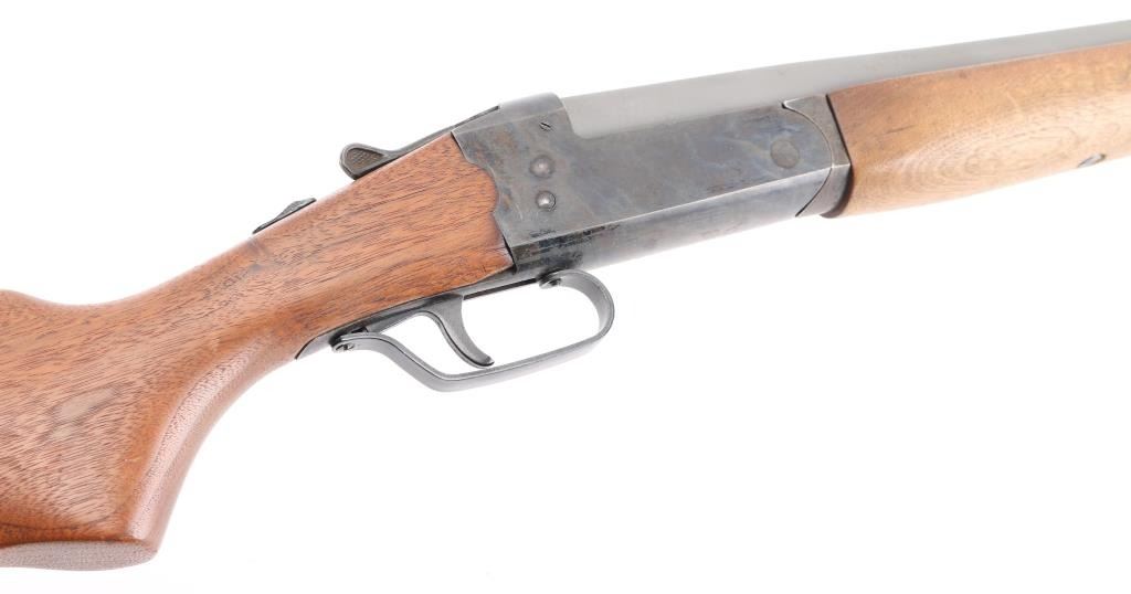 Single shot break action shotgun with 28" barrel, matte gray finish, case hardened receiver, plain pistol grip wood stock and forearm, serrated safety lever on tang and smooth trigger. Bore and action are excellent. Condition is NRA Excellent. Modern Firearm.