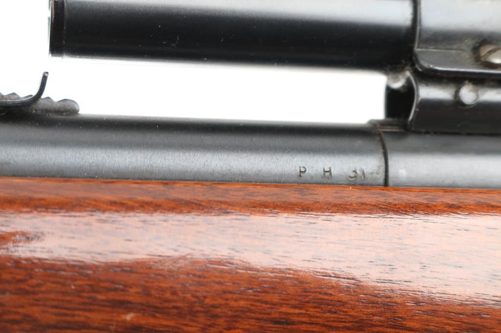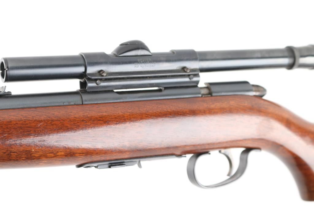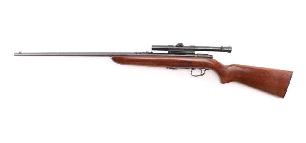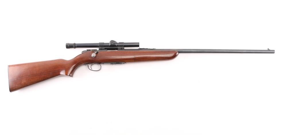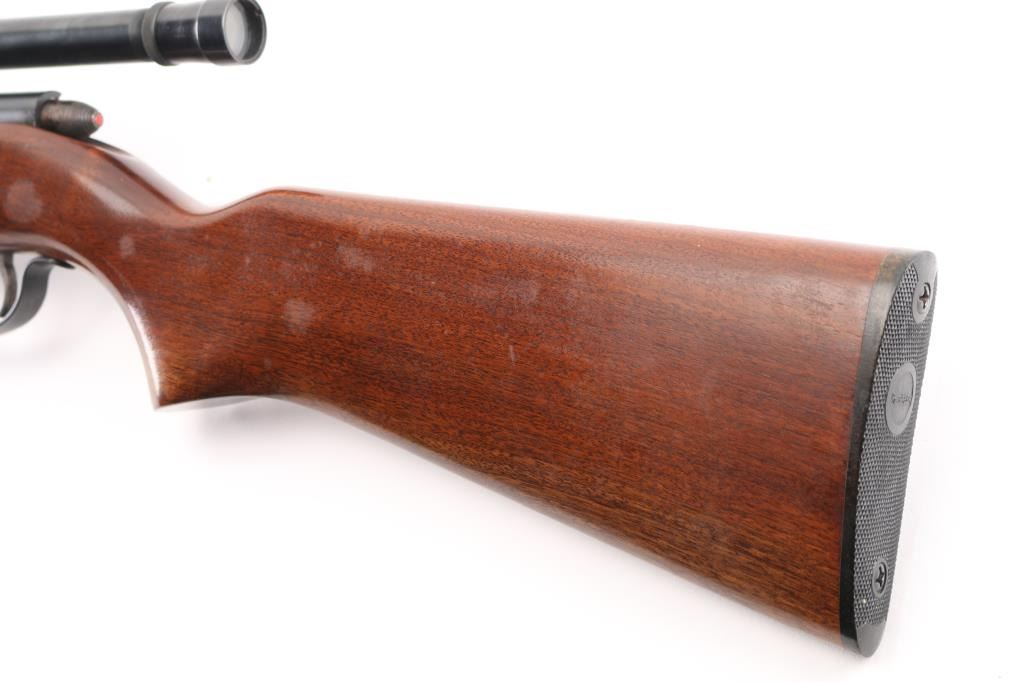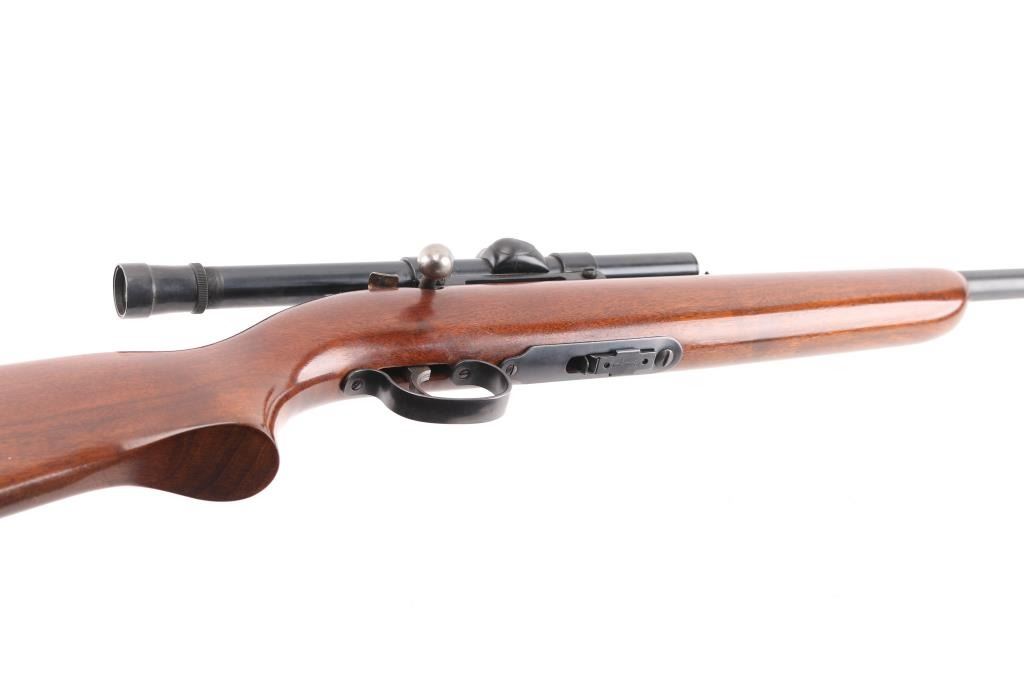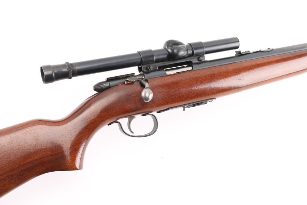 'Scoremaster' Bolt action rimfire rifle. Features blued finish, 25" barrel, blade front & sporting rear sights, grooved receiver with 4x Weaver B4 scope (fine crosshair), manual safety, cocked indicator, detachable magazine, smooth wood stock, plastic buttplate. Bore is very good bright condition. Retains 80% finish, mostly very good, large scraped or cleaned area on barrel. Wood is very good. Condition is NRA Very Good *** C&R Firearm ***