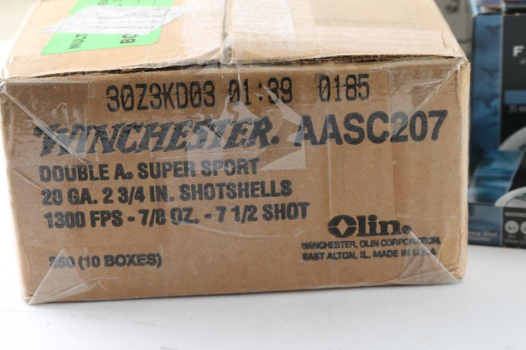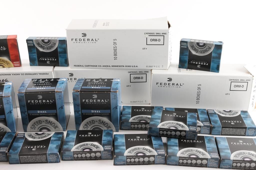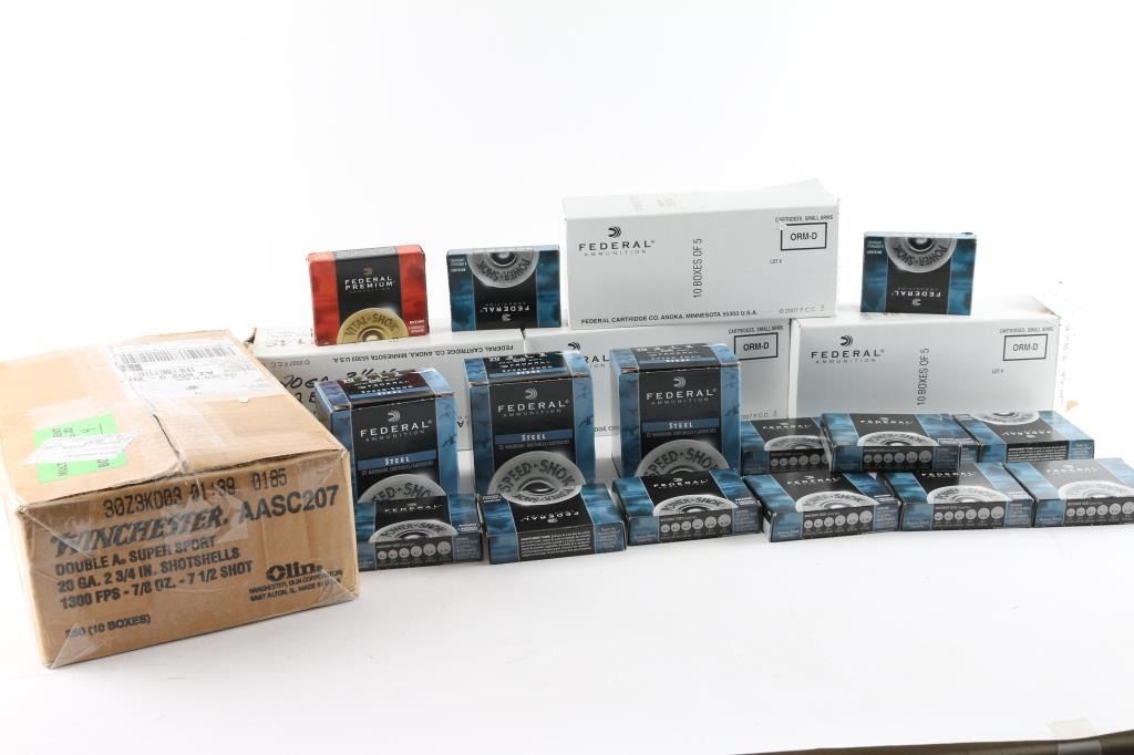 Approx. 575 rounds of 20 Gauge factory new shotshells. Federal & Winchester, 2 3/4", 3" and various shot sizes. All in factory boxes.