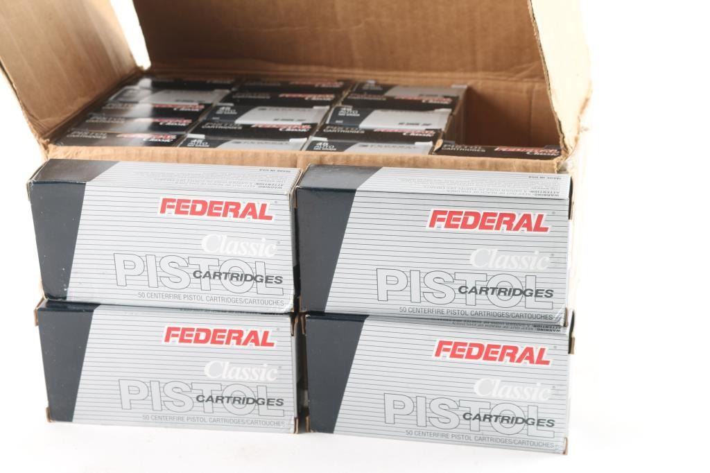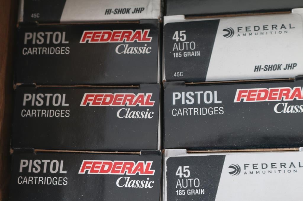 Approx. 1000 rounds of 45 Auto factory new ammunition. Federal 185 Gr. JHP. 20 factory boxes of 50 rounds each, all in 1 case.