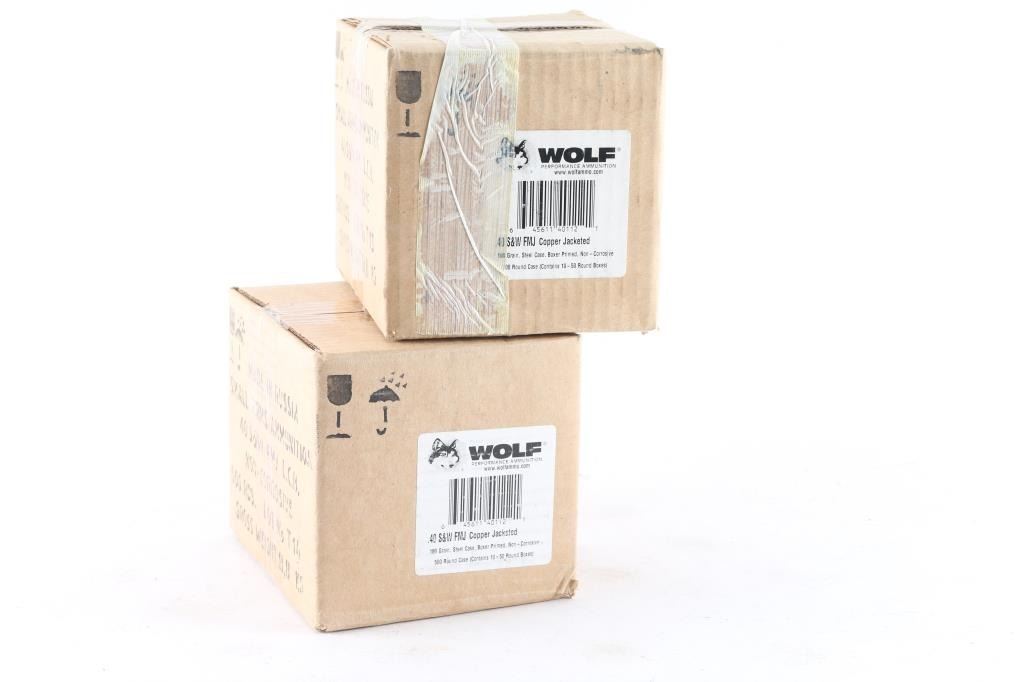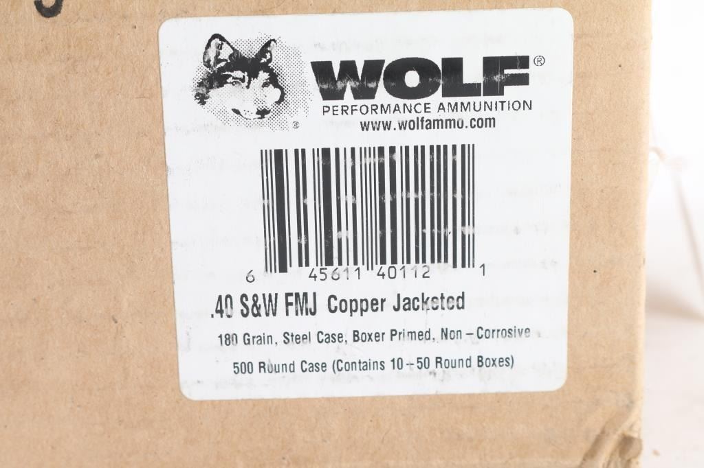 Approx. 1000 rounds of 40 Smith & Wesson factory new ammunition. Wolf 180 Gr. FMJ. 10 factory boxes of 50 rounds in each case, 2 cases.