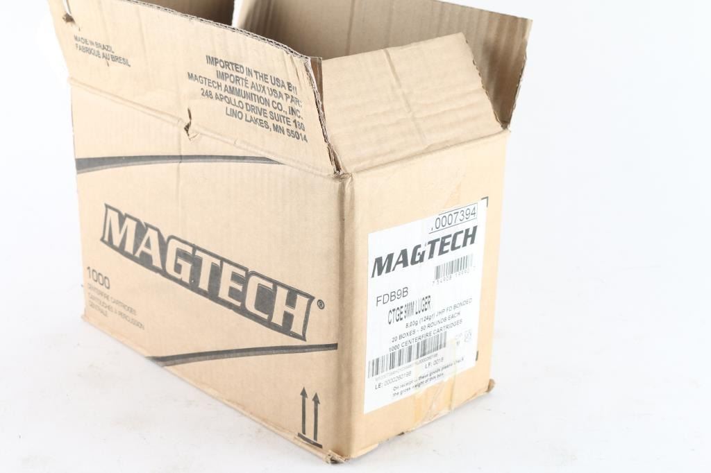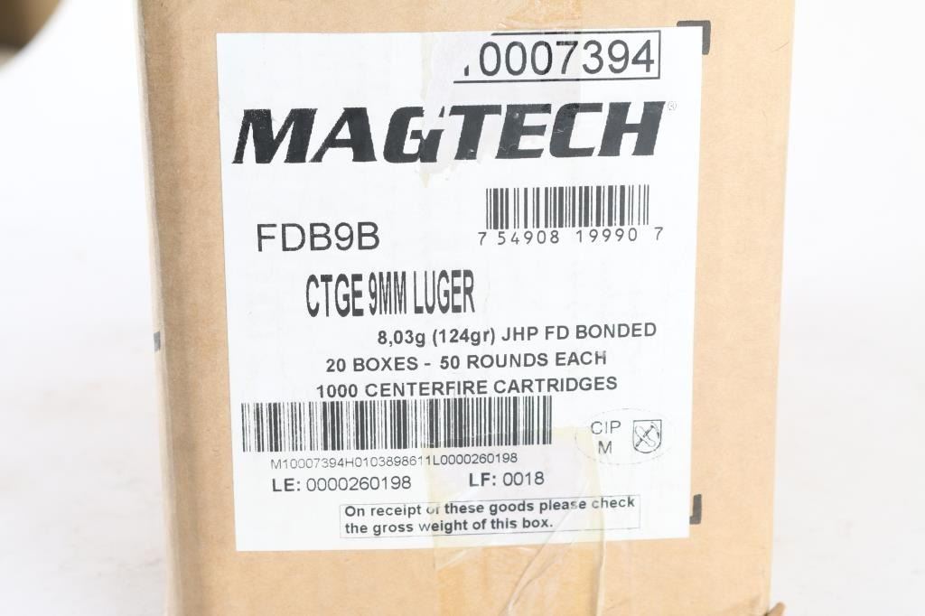 Approx. 1000 rounds of 9mm factory new ammunition. Magtech 124 Gr. JHP. Factory boxes, 1 case.